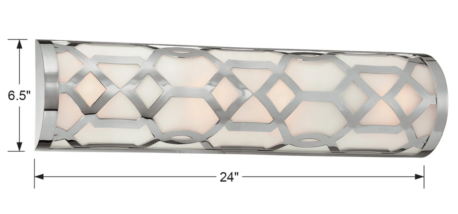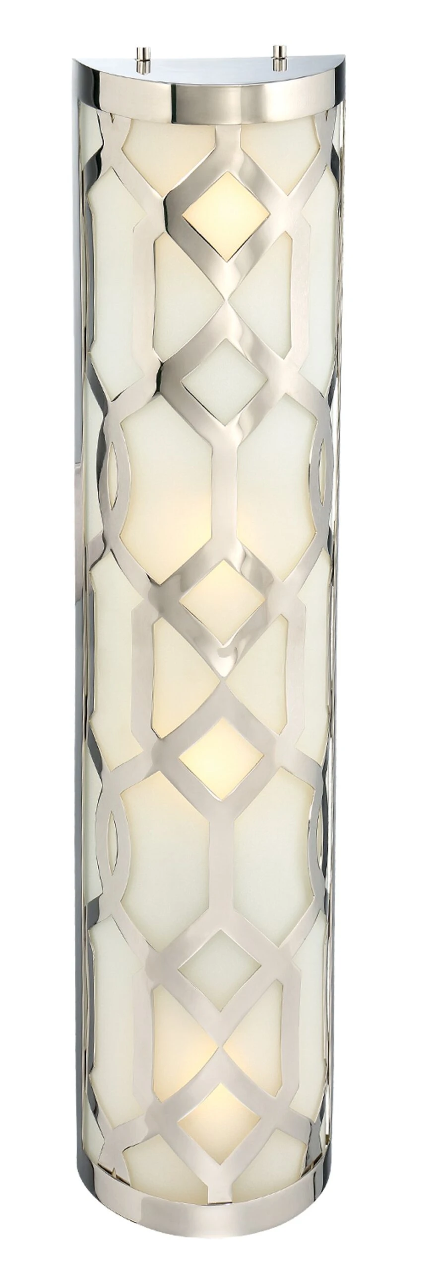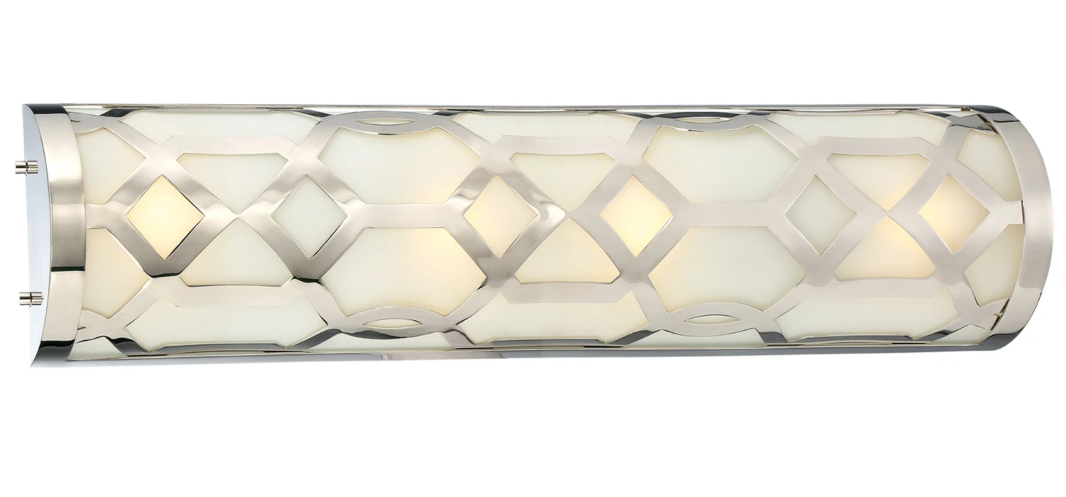 This bath fixture is crafted of steel with a timeless pattern in a polished-nickel finish that gives a graphic feel without overpowering a space. The frosted glass diffuser softens the light. Hardwired. From the Libby Langdon for Crystorama collection.
