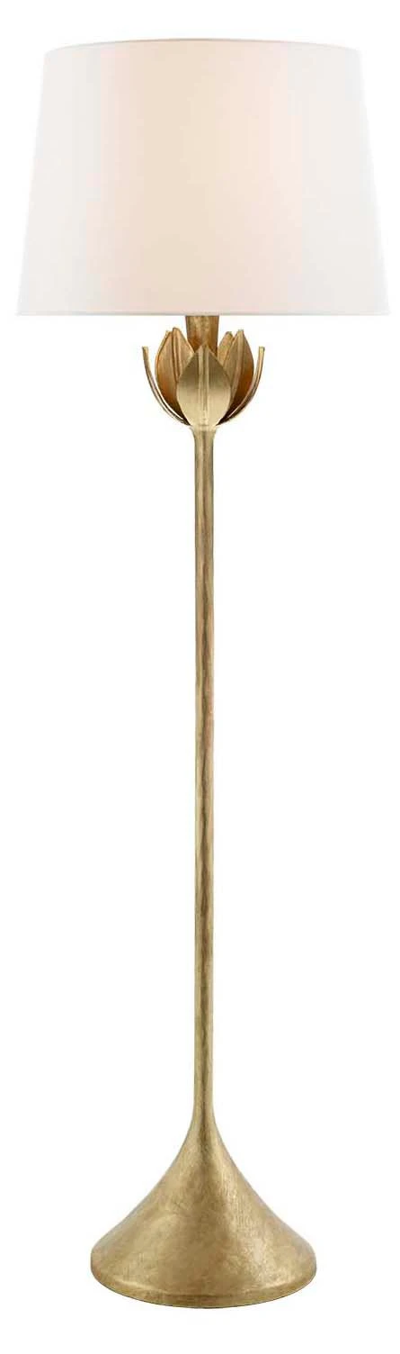 Designed by Julie Neill for Visual Comfort: A subtle way to incorporate botanical elements into your decor, this floor lamp is crafted of steel and thoughtfully designed with petal-like detailing and an antiqued gold-leaf finish. An off-white linen shade completes the design.