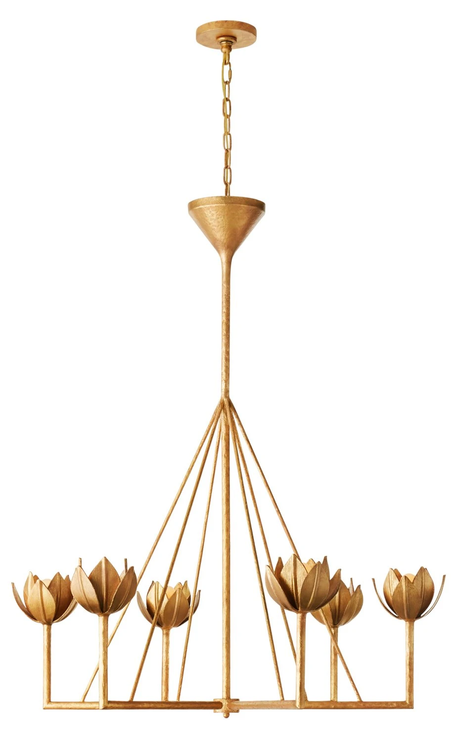 Designed by Julie Neill for Visual Comfort: A subtle way to incorporate botanical elements into your decor, this single-tier chandelier is crafted of steel and thoughtfully designed with petal-like detailing and an antiqued gold-leaf finish. Hardwired.