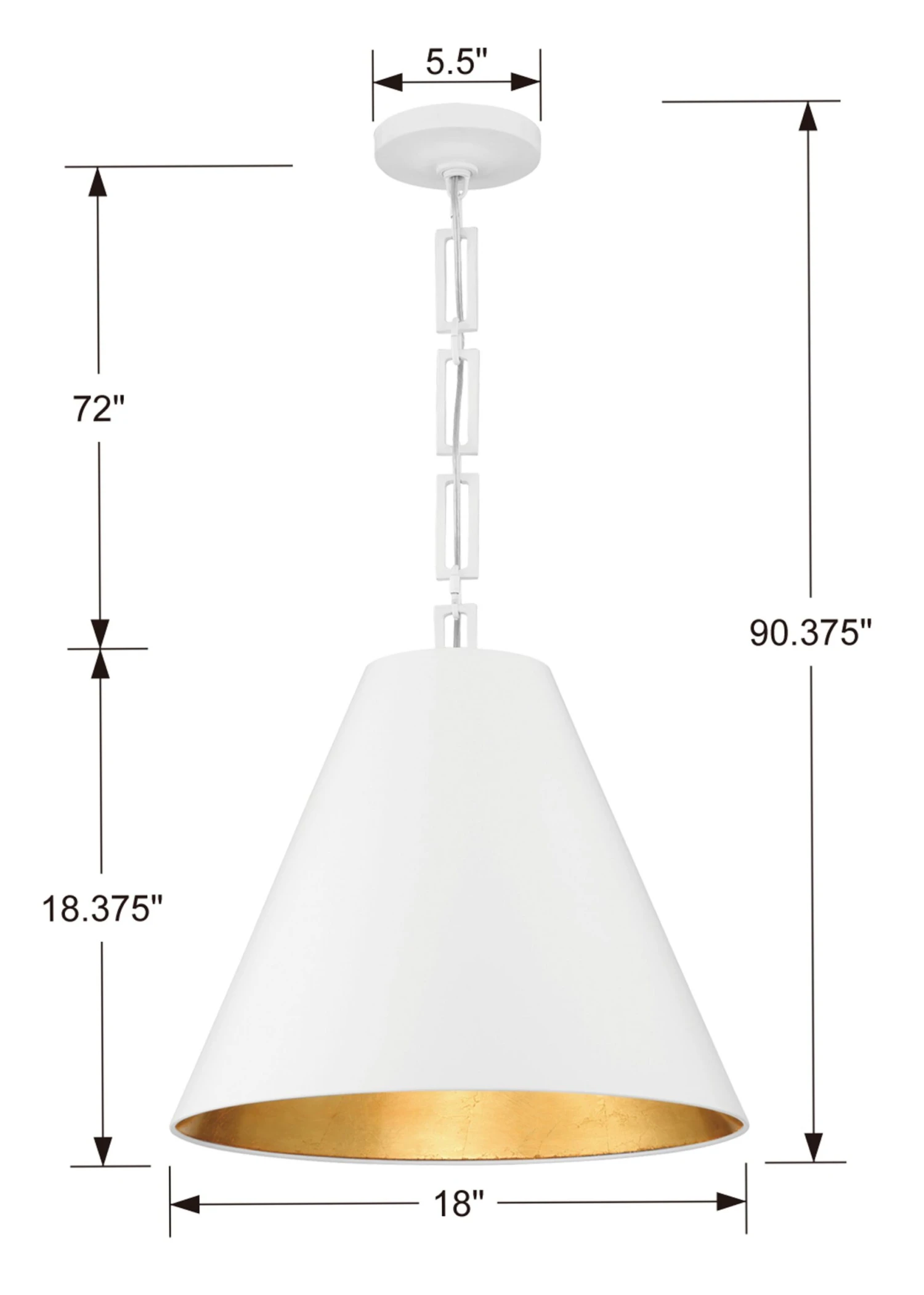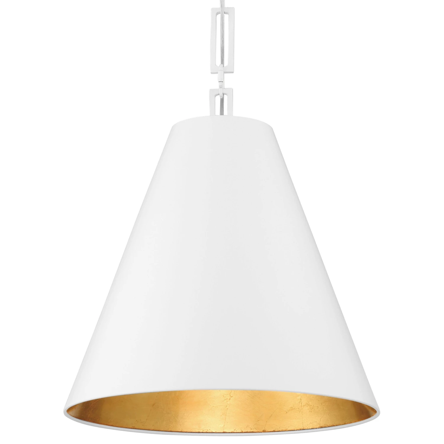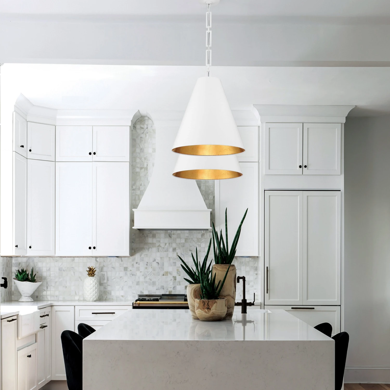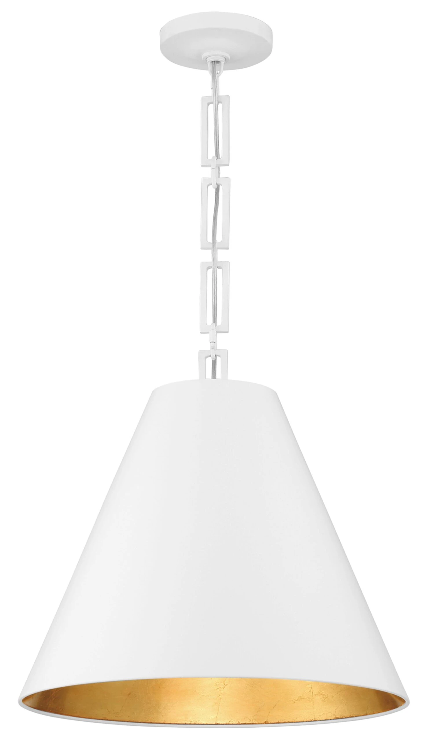 Inspired by the sleek lines of Mid-Century Modern design, this fixture pairs a conical shade with a chain made of rectangular links. The shade’s gold interior ensures a warm, flattering glow when the fixture is on and provides a glamorous complement to the matte white finish of the exterior when it’s off.