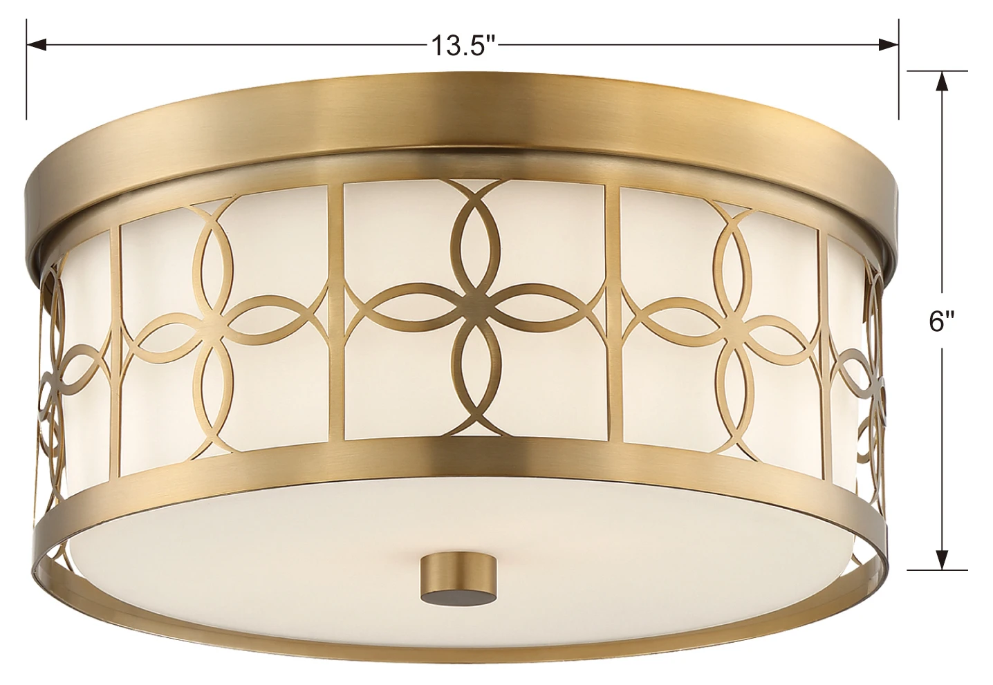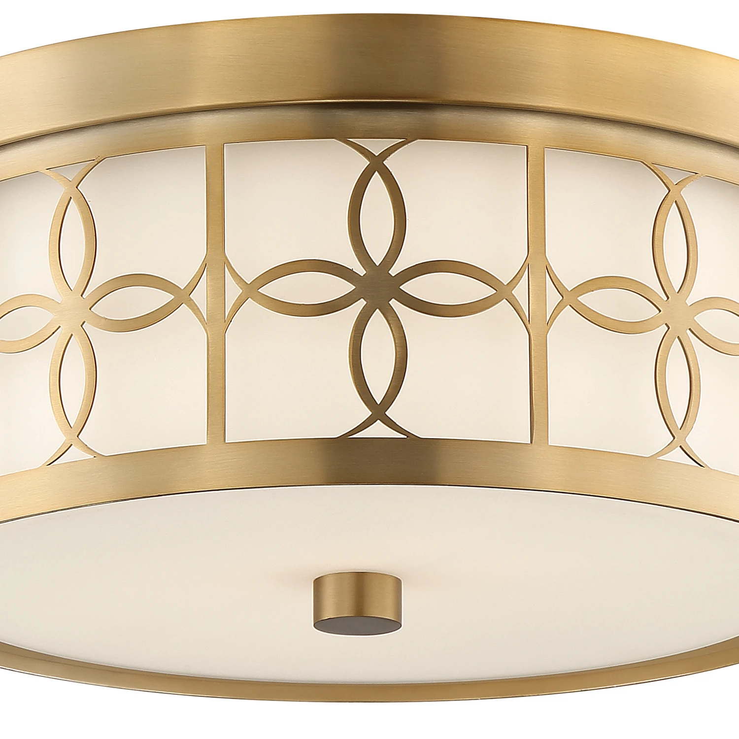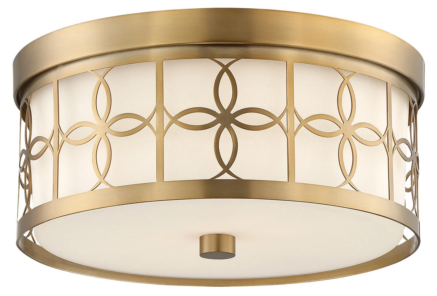 The warm golden finish and graceful motif of the metal overlay add timeless elegance to this two-bulb ceiling fixture. The white glass shade ensures a soft, flattering glow.