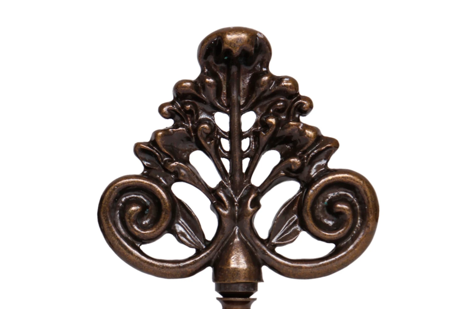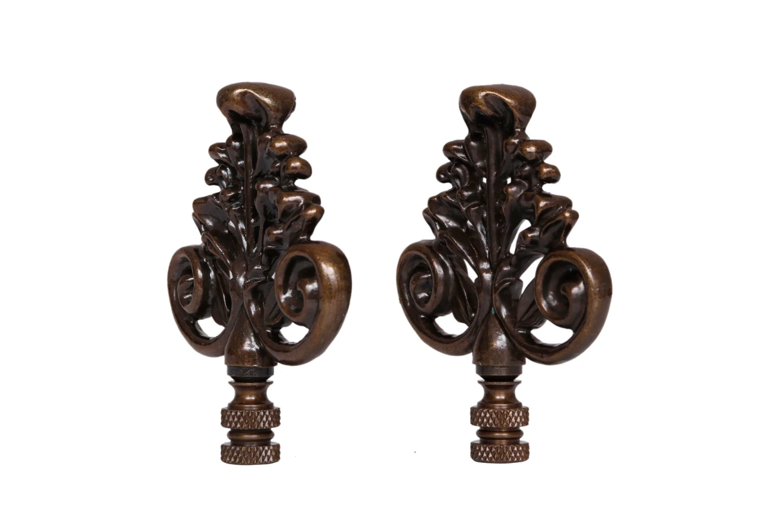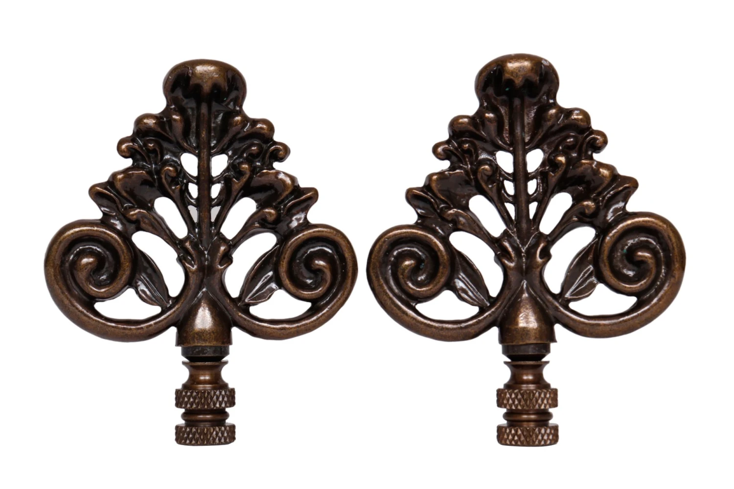 A pair of antiqued brass scroll tree lamp finials. Fits a standard size lamp harp. Dimensions per finial.