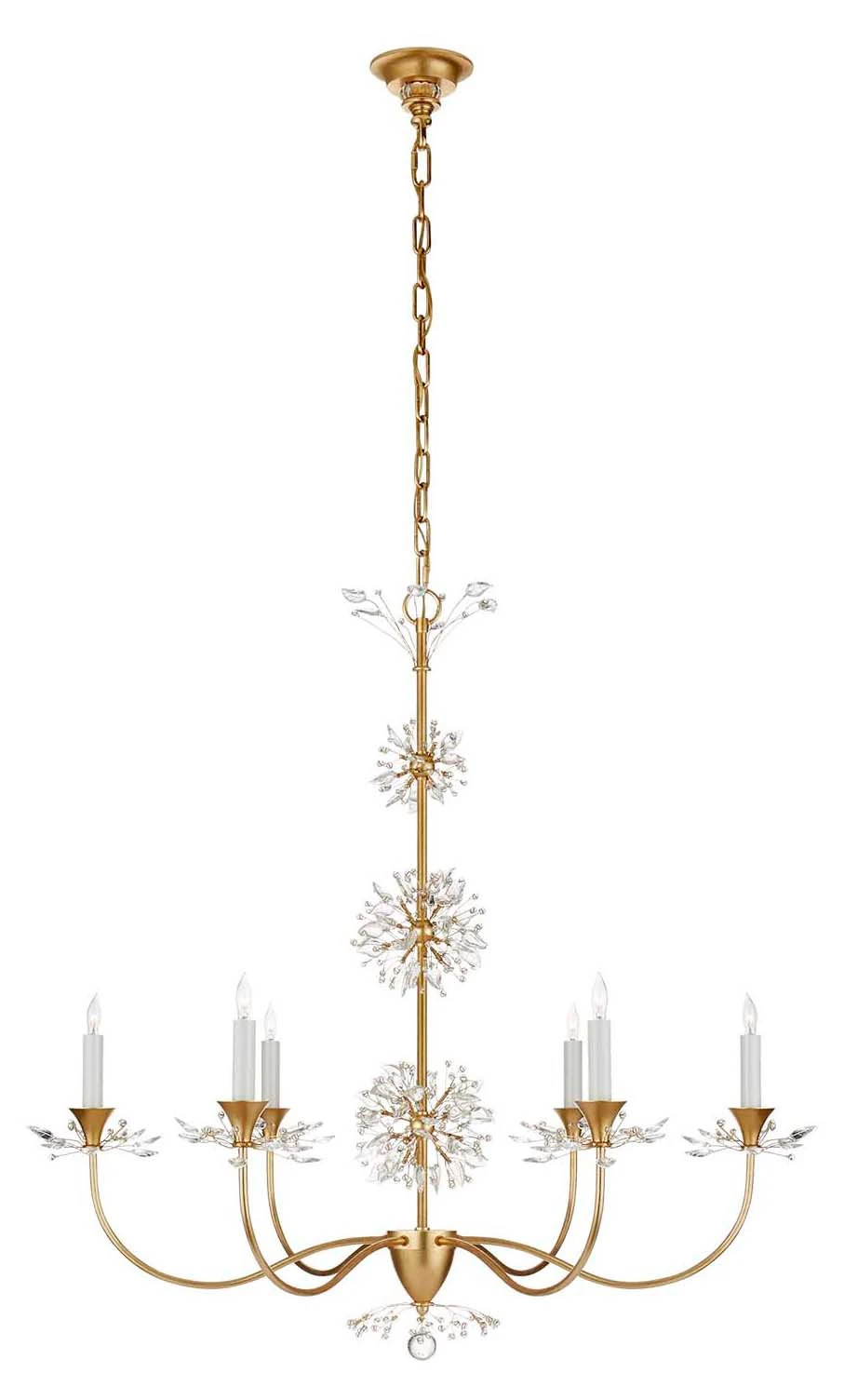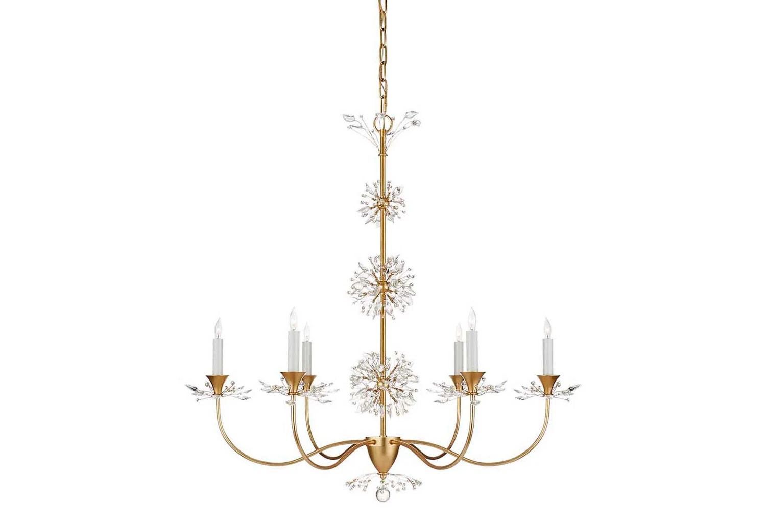 Designed by Julie Neill for Visual Comfort: A subtle way to incorporate botanical elements into your decor, this stunning chandelier is crafted of steel in a golden finish and thoughtfully decorated with crystal sprig elements. Hardwired.