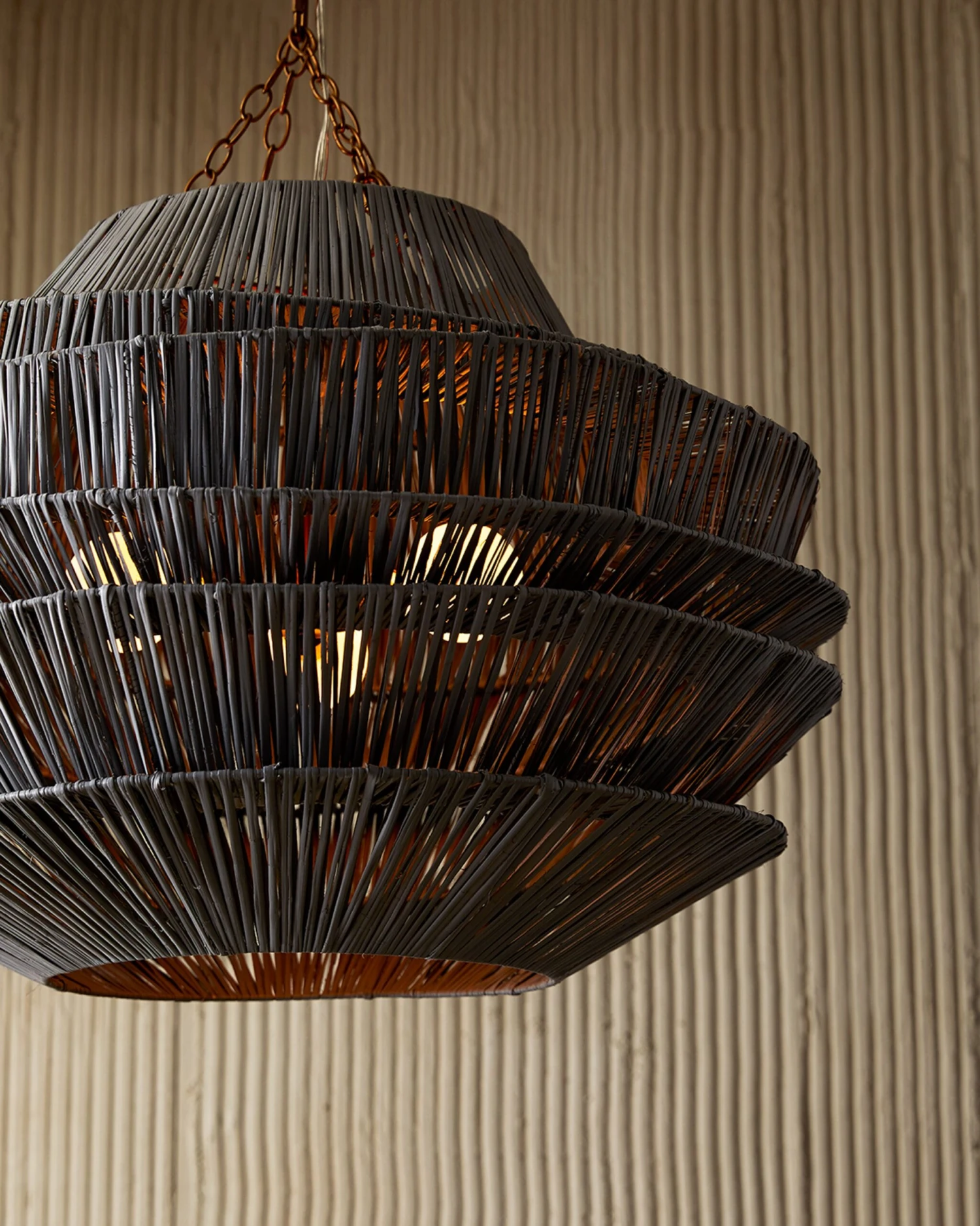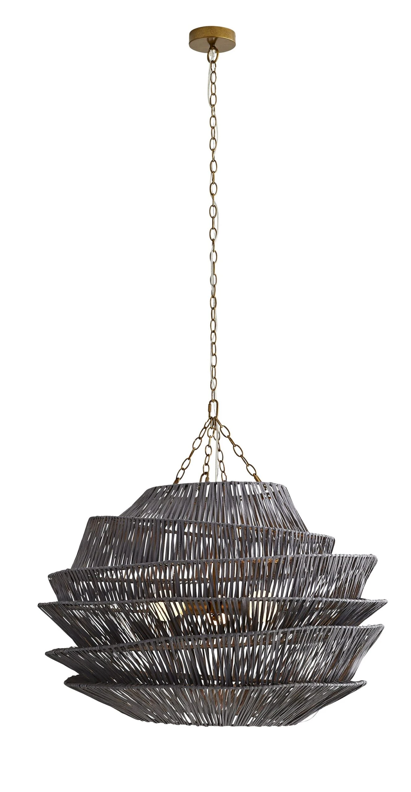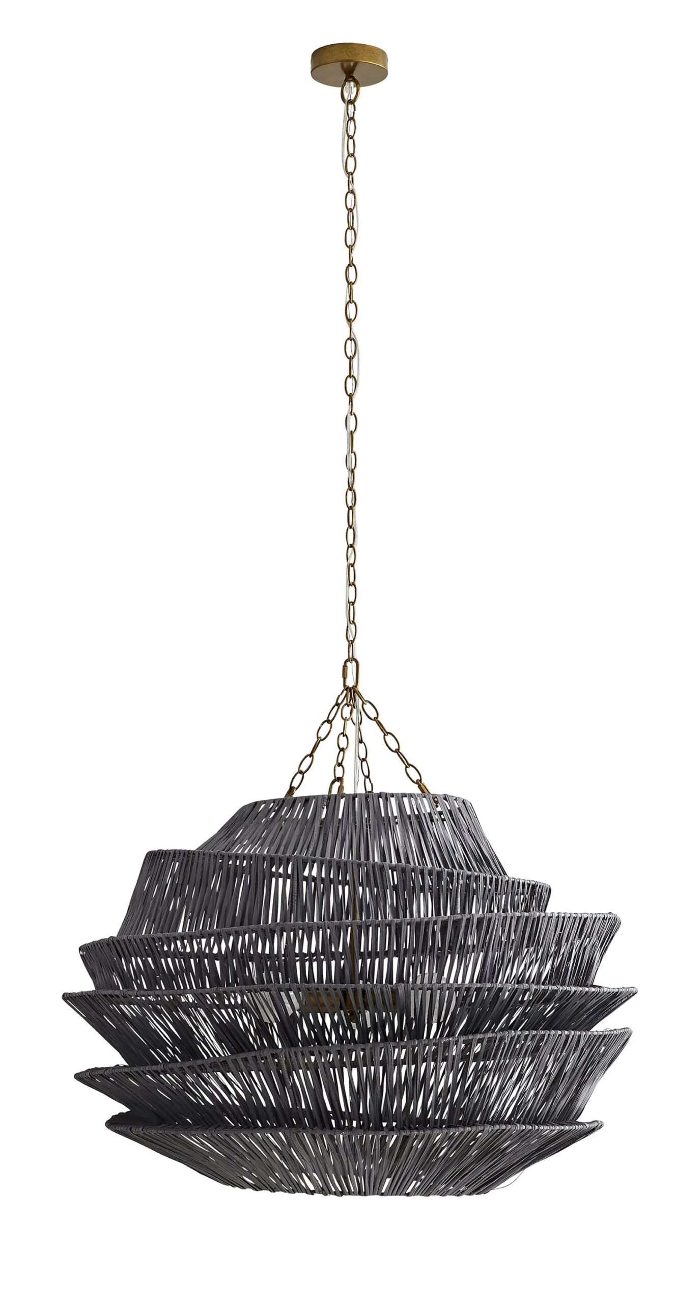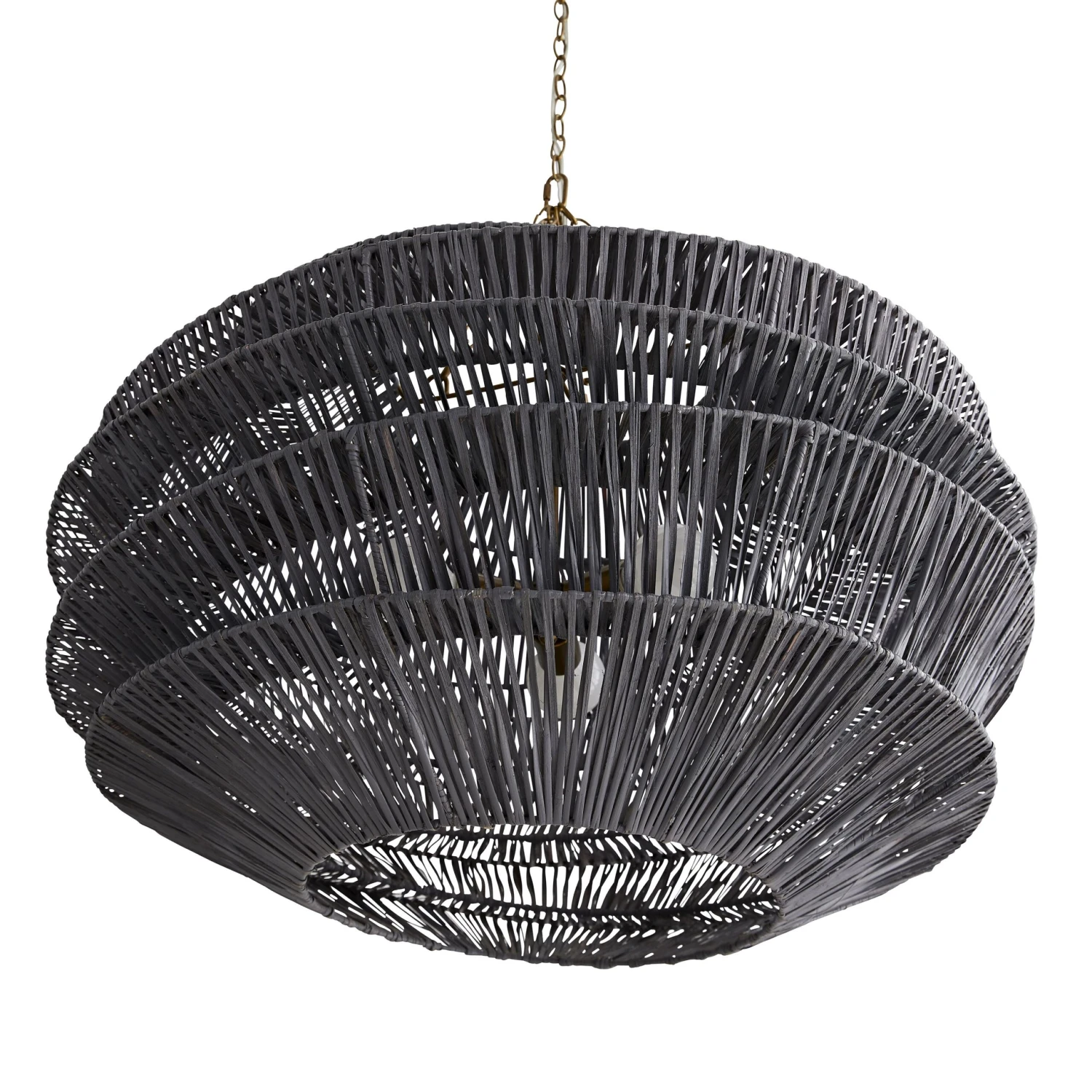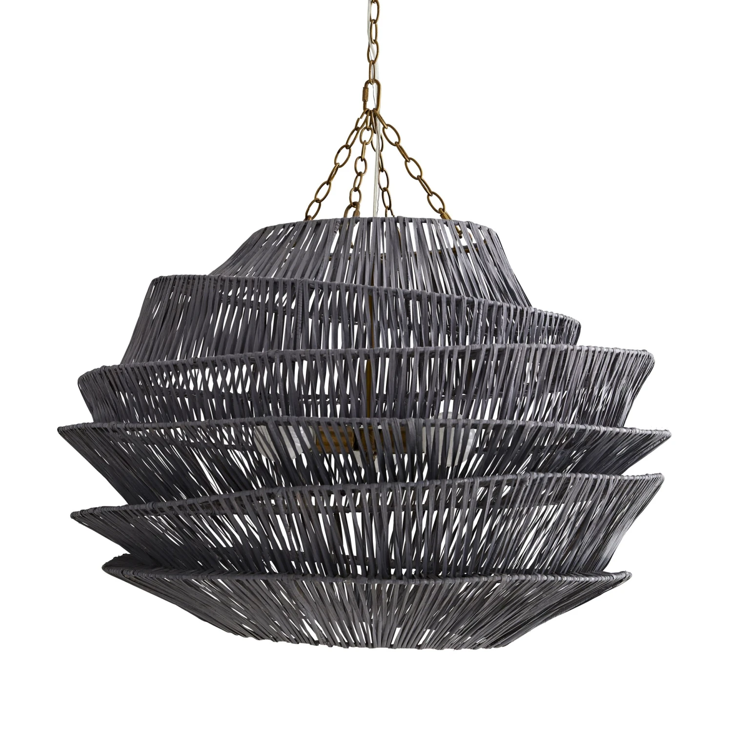 Showcasing a step-like silhouette that appears to cradle each tier into the other, this three-light pendant is crafted entirely from thin, handwoven raffia on a metal frame. Antiqued brass hardware and a gray wash finish add a modern finishing touch. Due to the handmade nature of this piece, variations in color, tone, and pattern may occur. Hardwired.