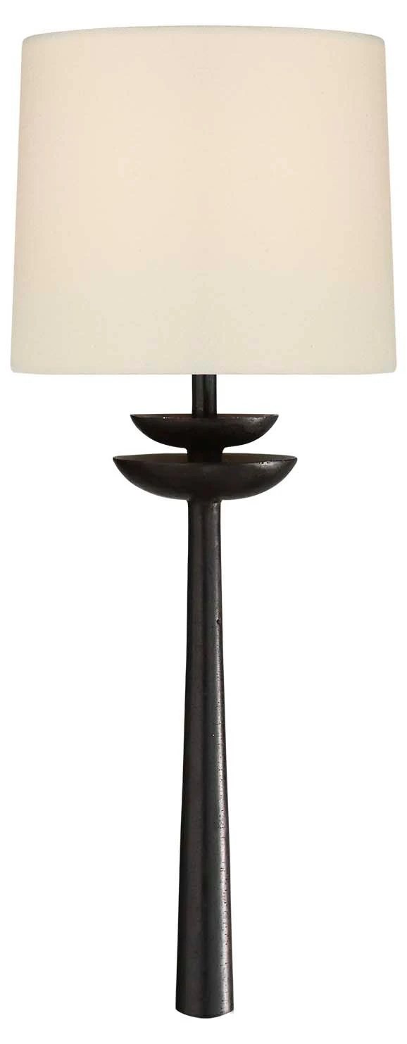A refined addition to any interior, this sconce is crafted of iron with a handsome aged finish and neutral linen shade. Hardwired.