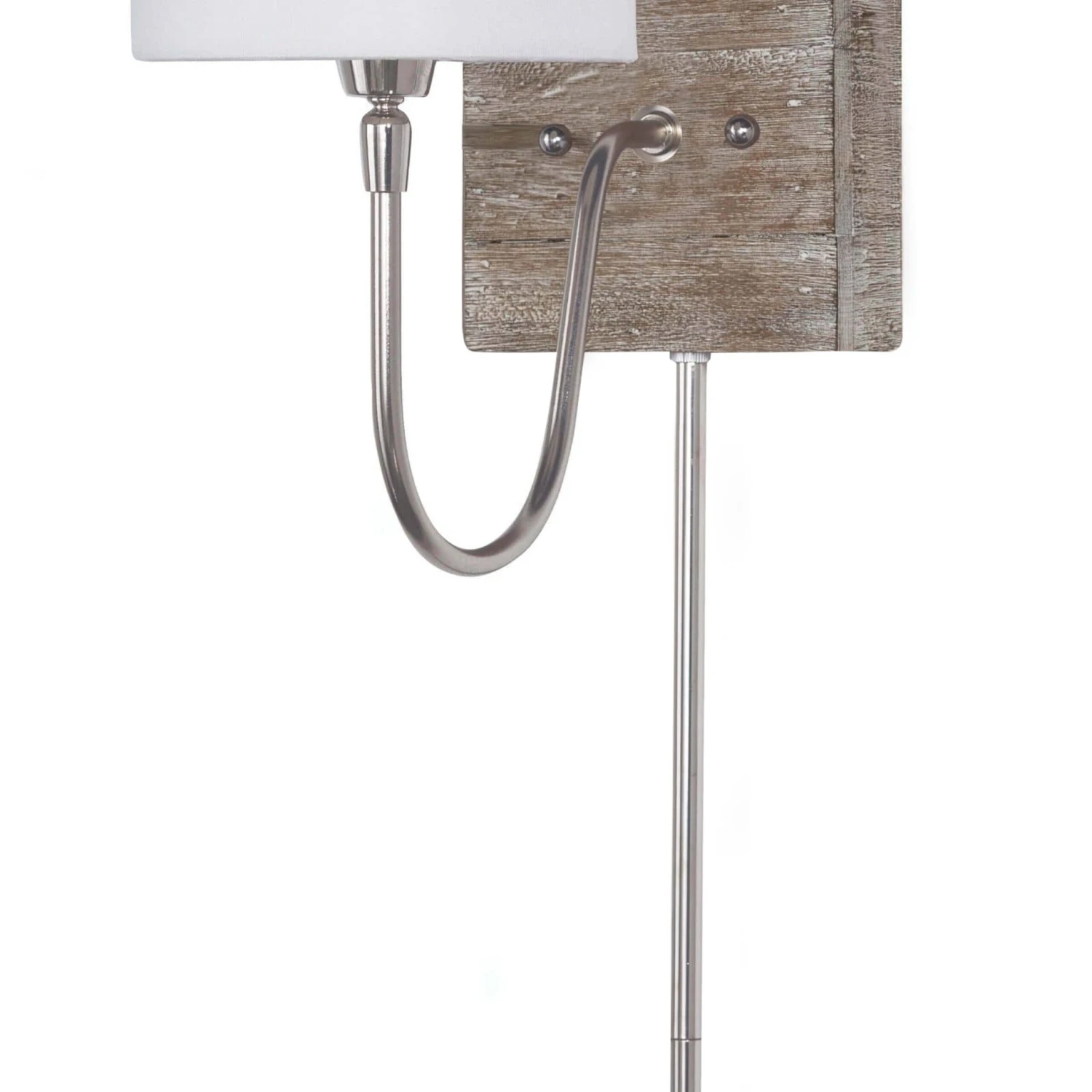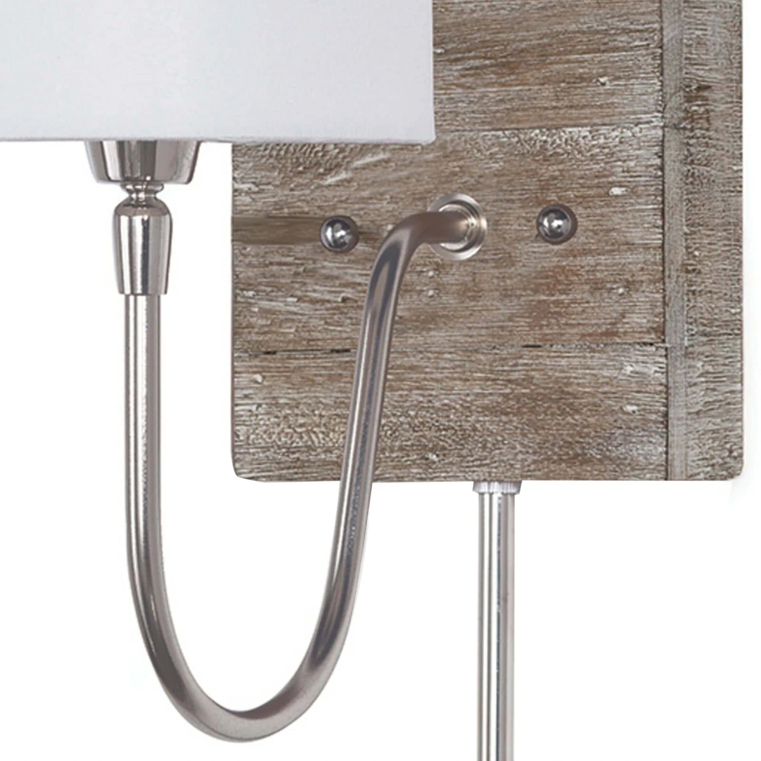 The sleek lines of this metal sconce provide the perfect contrast with the distressed wood mounting.