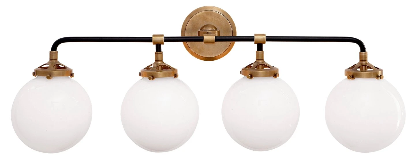 Available online exclusively at One Kings Lane: This four-light sconce from designer Ian K. Fowler is crafted of brass with a handsome two-tone finish and white glass globe shades. Because this item is damp rated, it can be used in any room of the home, including the bathroom. Hardwired.