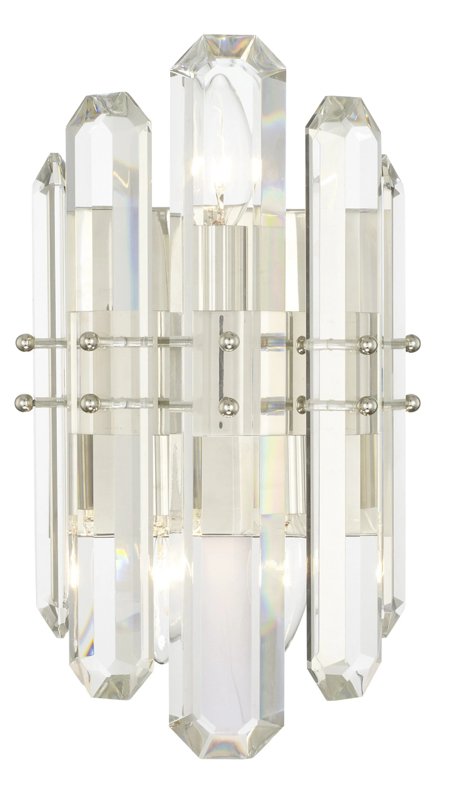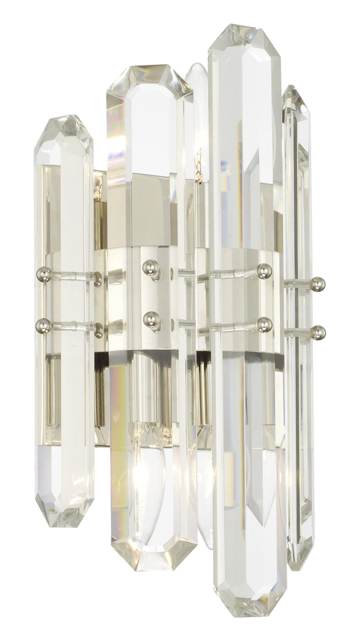 Framed in steel with a polished nickel finish, this sconce is embellished with faceted crystals for a glamorous touch. Hardwired.