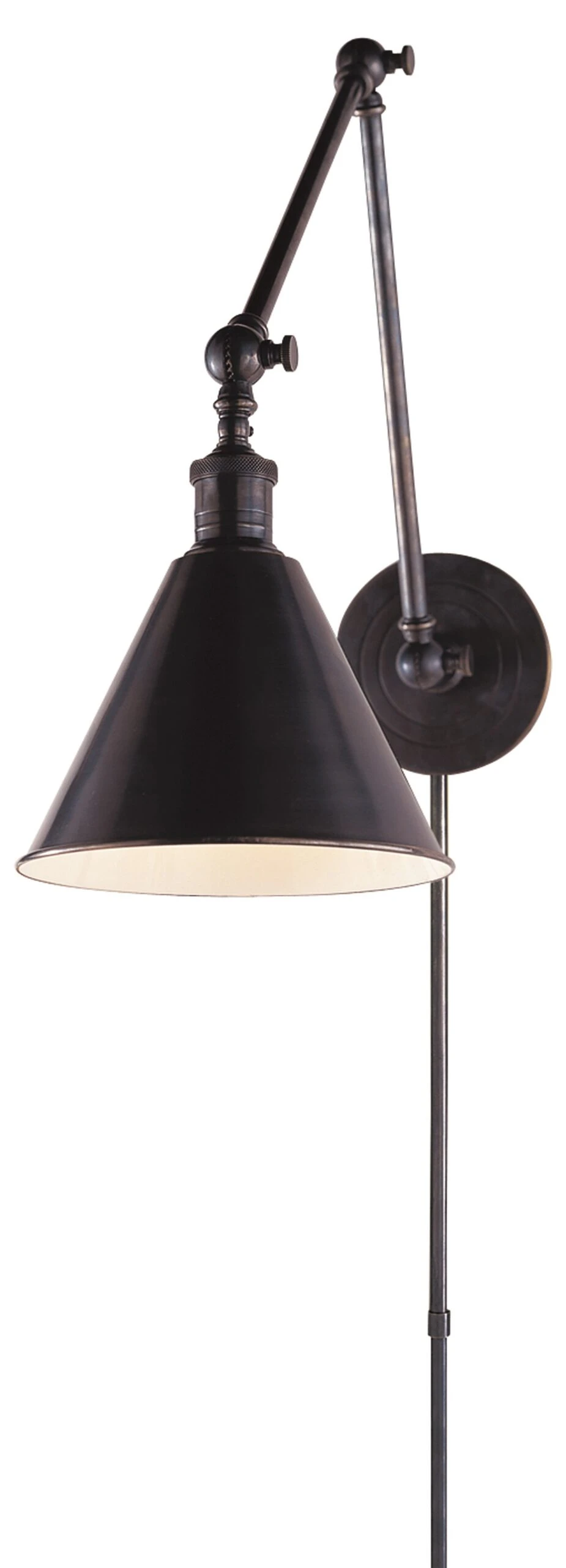 dimensions: 16″h x 15.5″ extension; backplate, 4.5″dia; shade, 2″ x 7″ x 5″