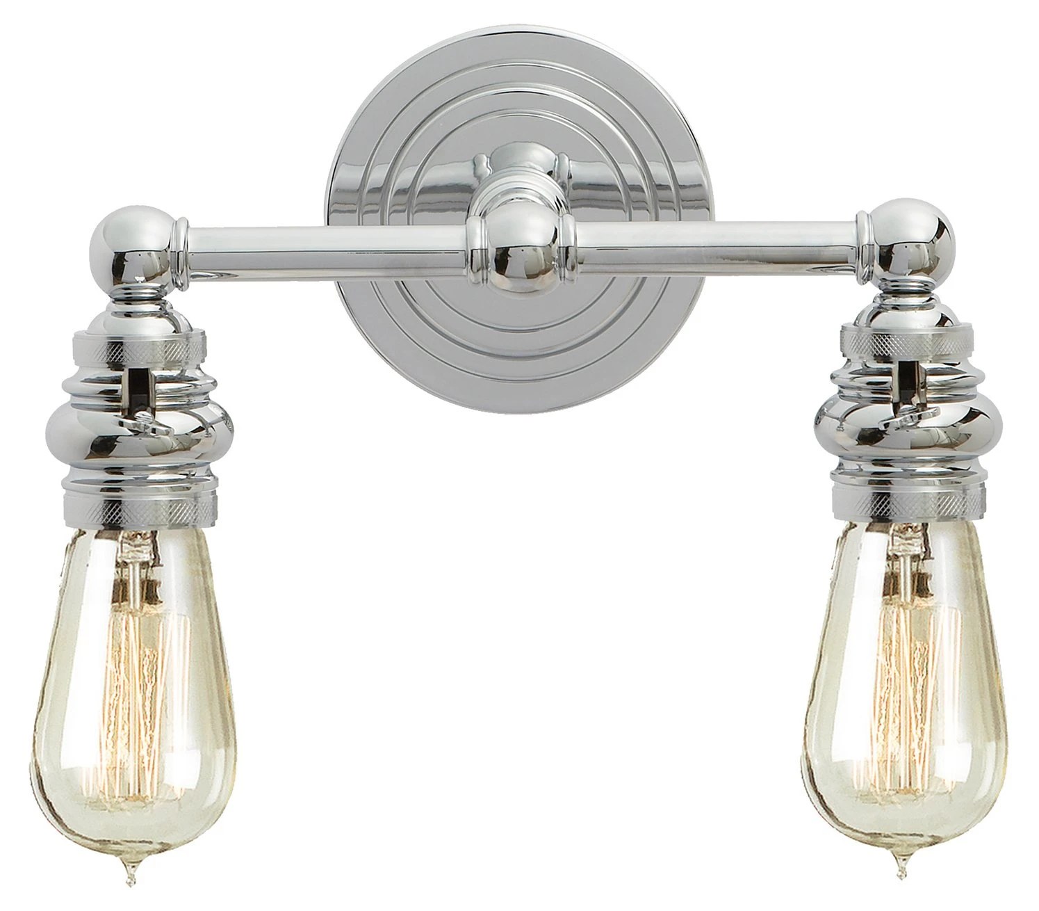 Illuminate an entryway, staircase, or bedside with this industrial-style bath bar or wall sconce. Its two exposed bulbs are mounted to a sleek fixture made of nickel, chrome, and steel. Because this item is damp rated, it can be used in any room of the home, including the bathroom. Hardwired.