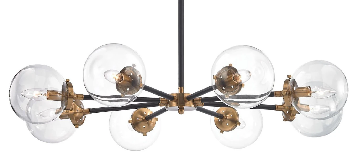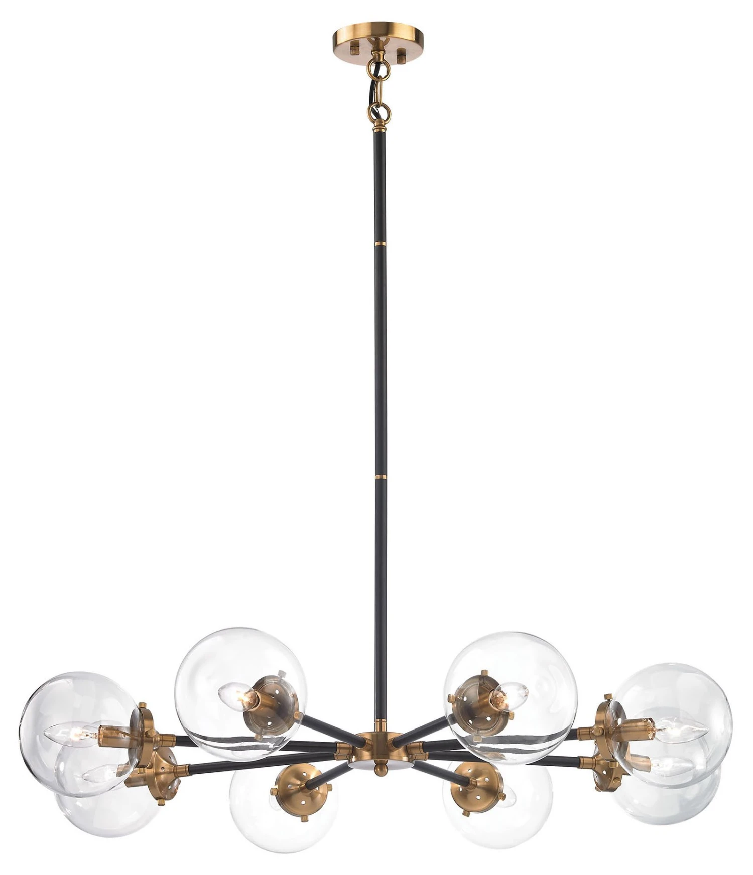 Destined to make an impression, this clean-lined chandelier is crafted of steel with eight spherical glass shades radiating from a central rod. Hardwired.