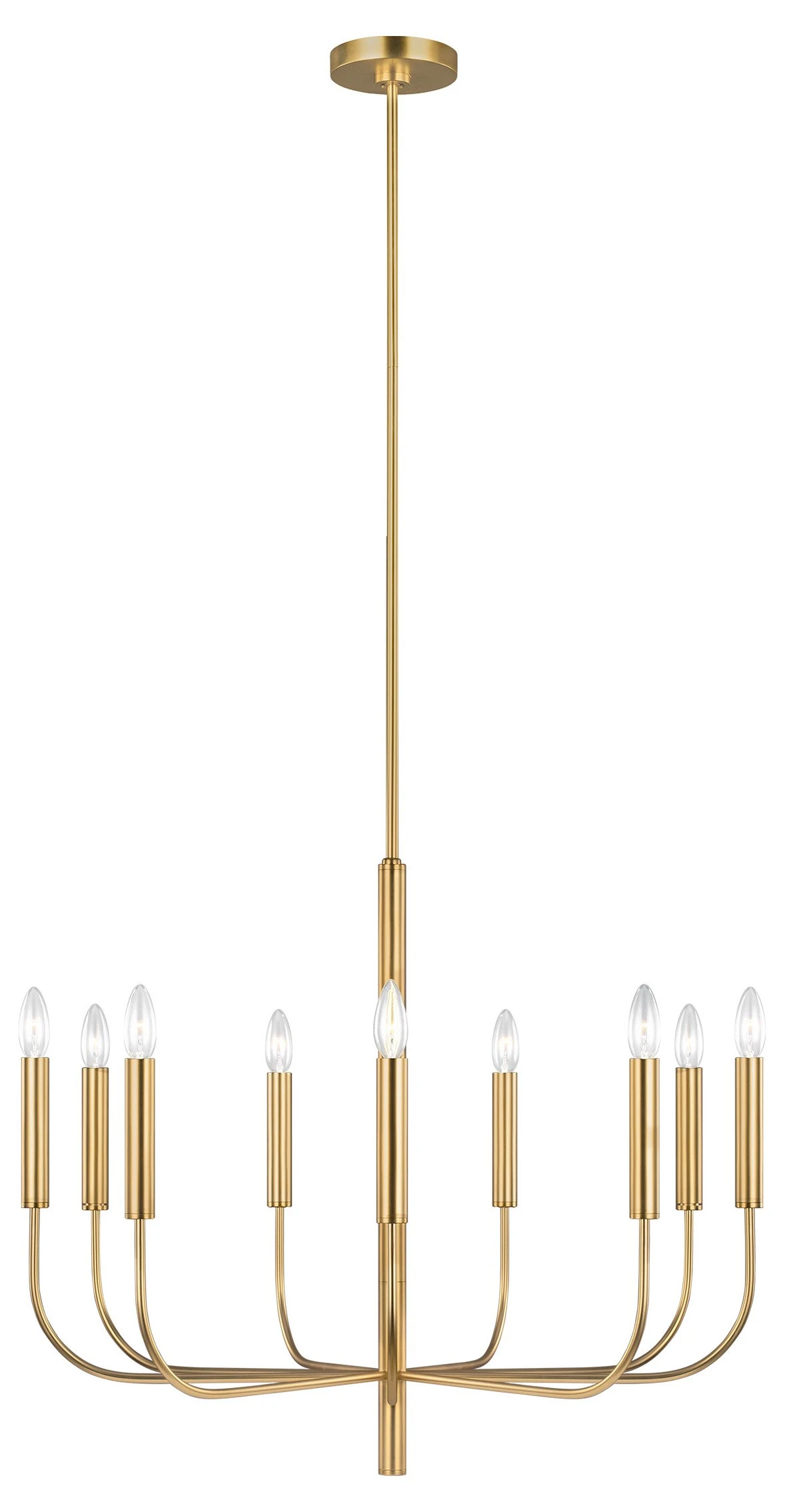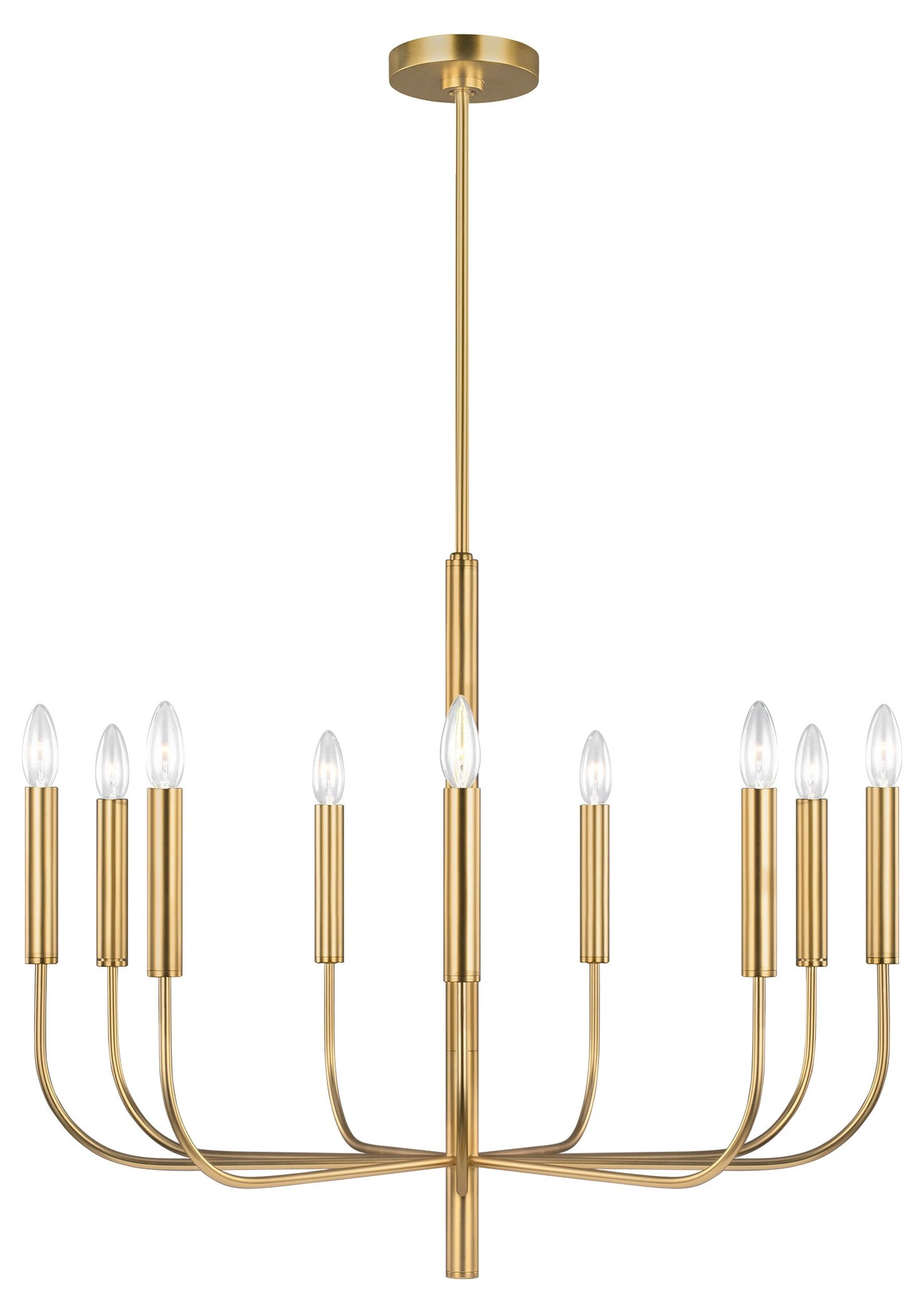 Crafted of steel in a burnished brass finish, this nine-light chandelier features a graceful, seamless curvature and elongated tubular arms that lend fluidity and modern appeal to its classic silhouette. Hardwired.
