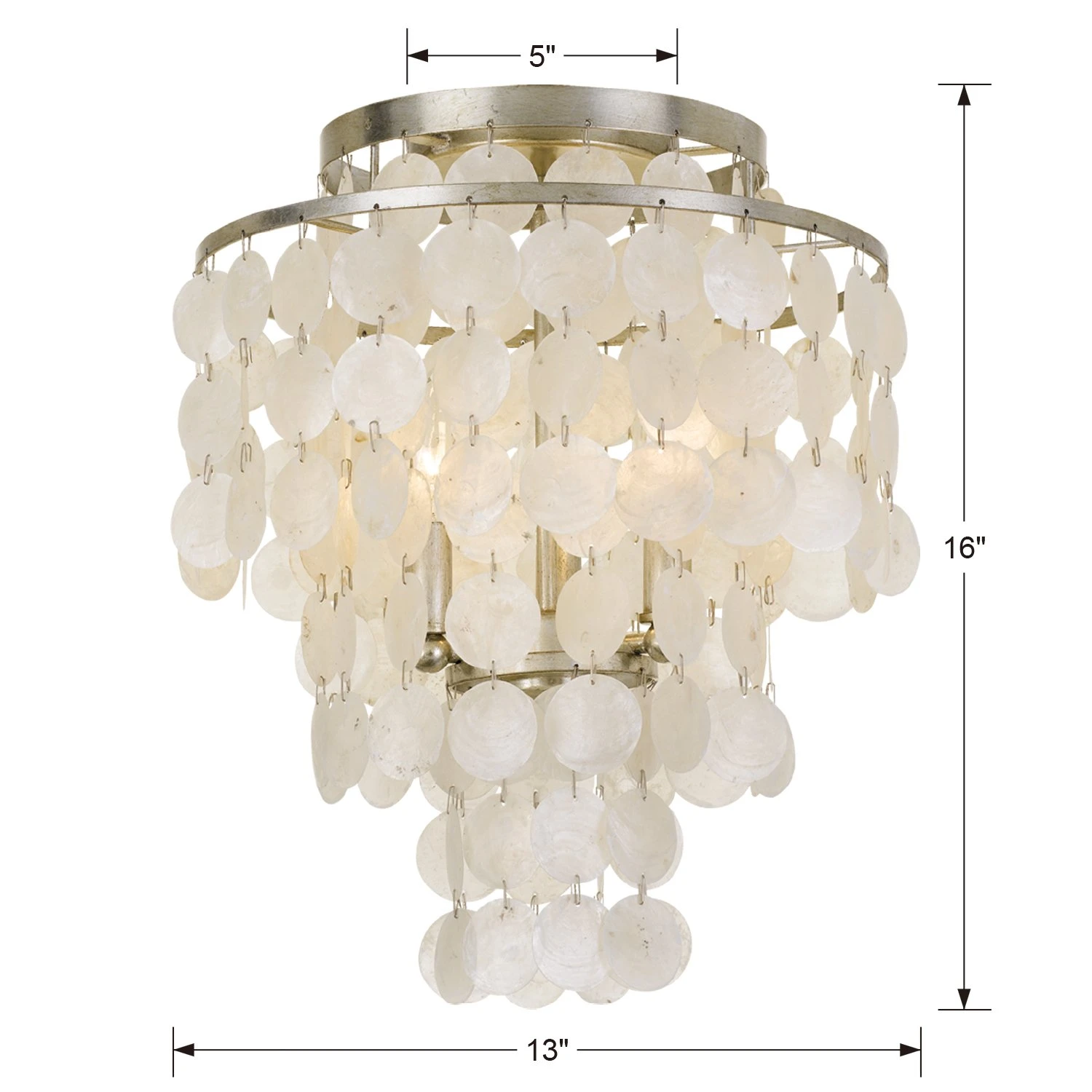 A naturally elegant addition to any room, this luminous semi-flush mount is framed in steel with an antiqued silver finish and embellished with tiers of shimmering capiz shells. Hardwired.