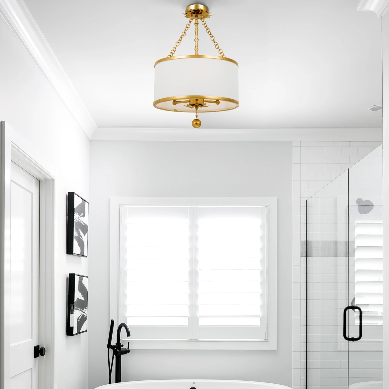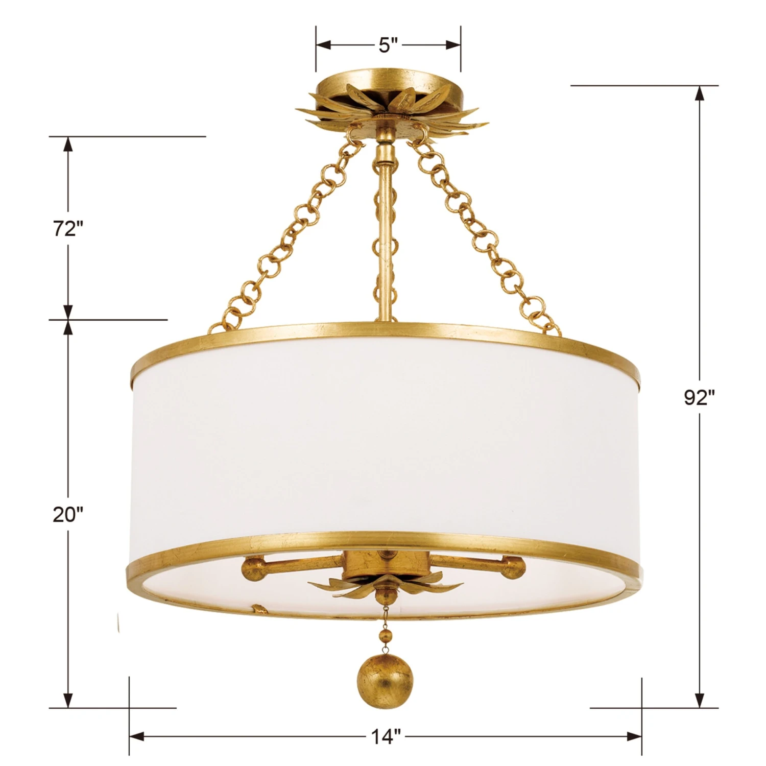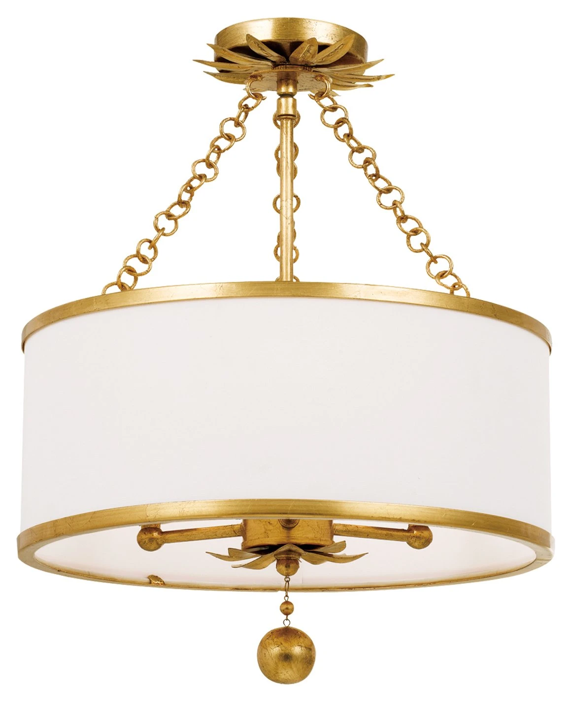 A wonderful way to add distinctive style to your decor, this versatile semi-flush mount is crafted of steel in an antiqued gold finish with shapely petal detailing and a white linen shade. Hardwired.