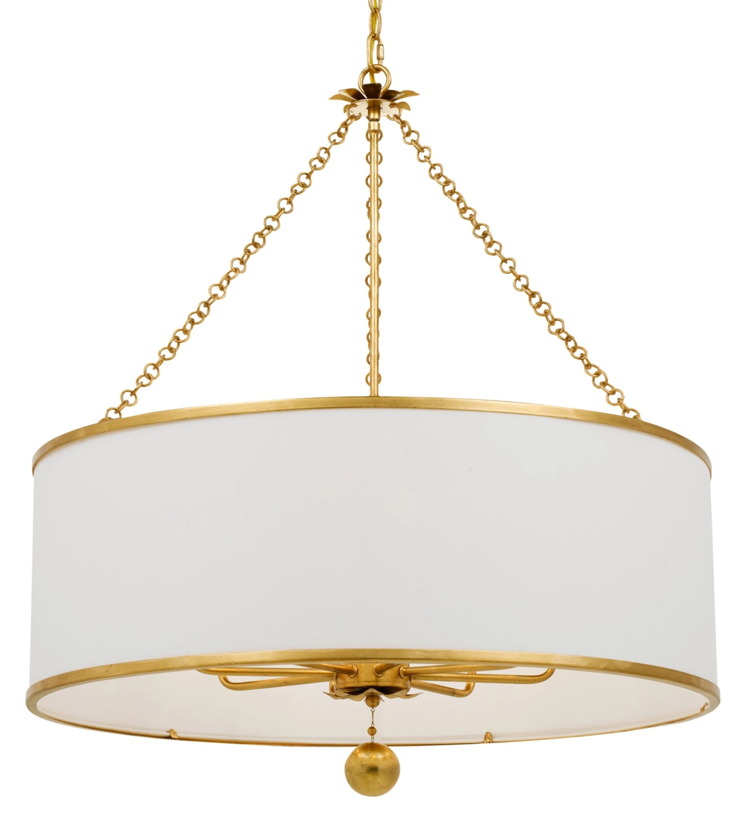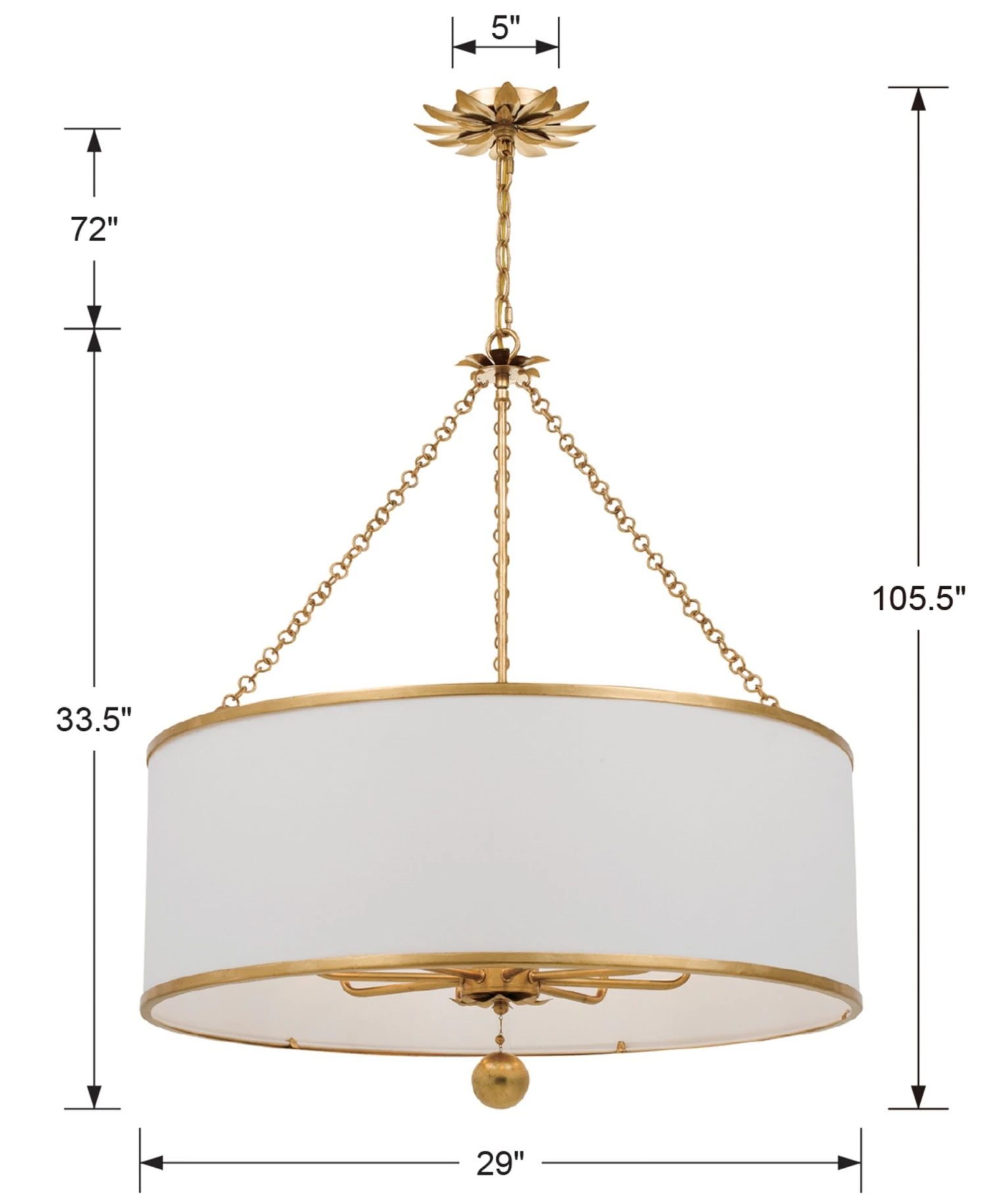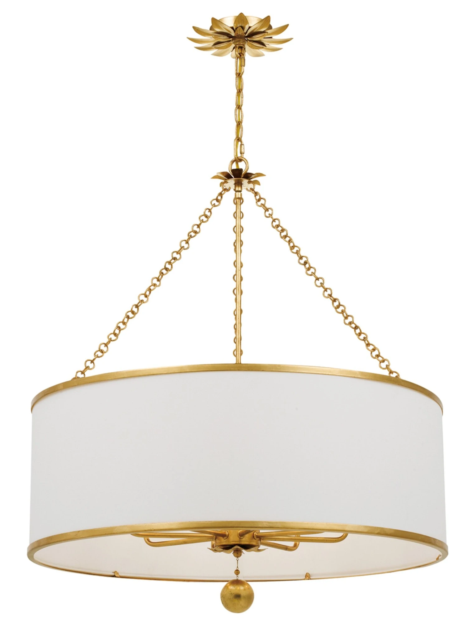 A wonderful way to add distinctive style to your decor, this versatile chandelier is crafted of wrought iron in an antiqued golden finish with shapely petal detailing and a white linen shade. Hardwired.