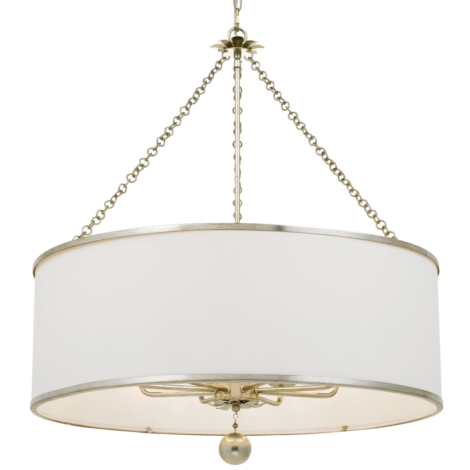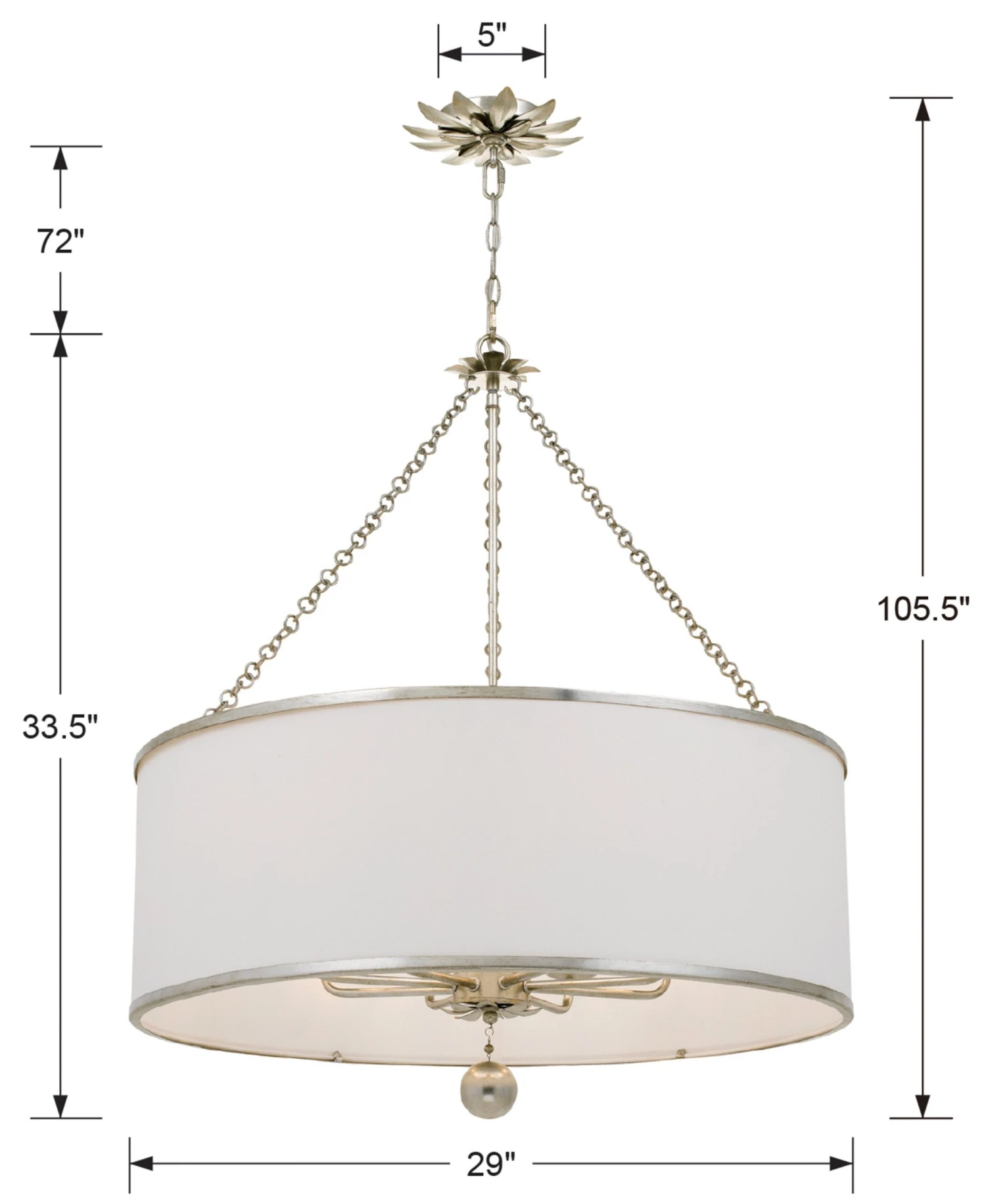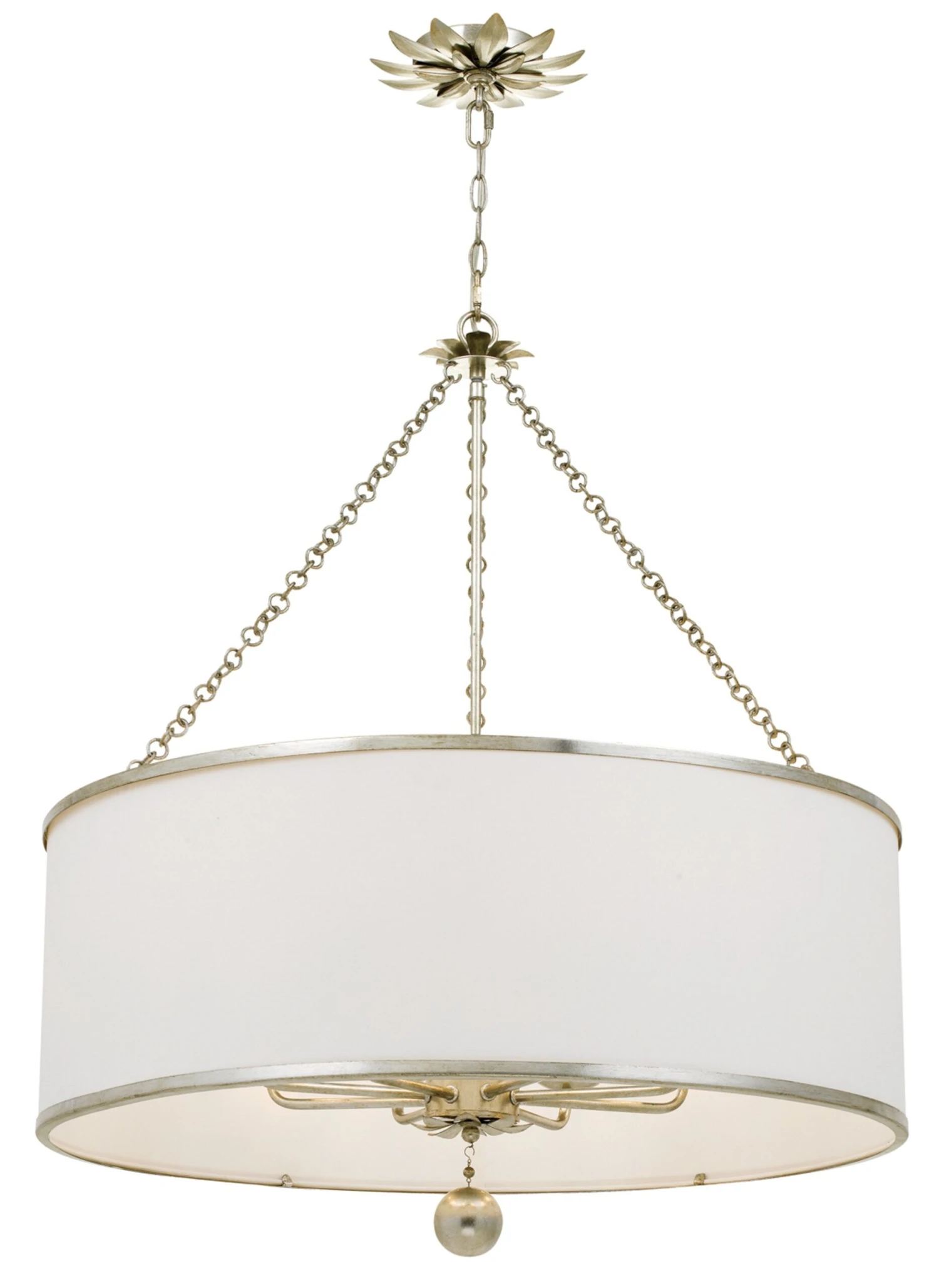 A wonderful way to add distinctive style to your decor, this versatile chandelier is crafted of wrought iron in an antiqued silver finish with shapely petal detailing and a white linen shade. Hardwired.