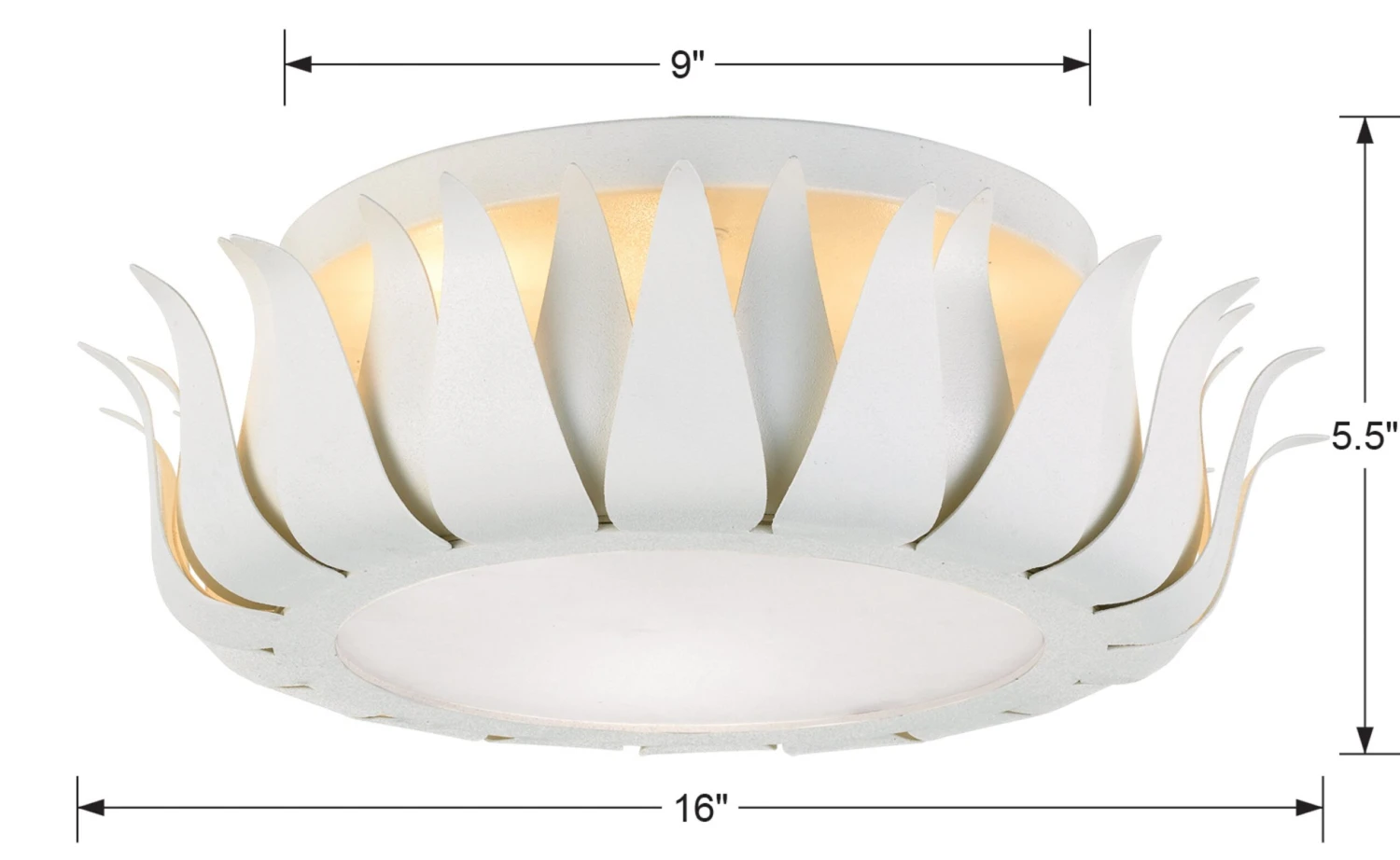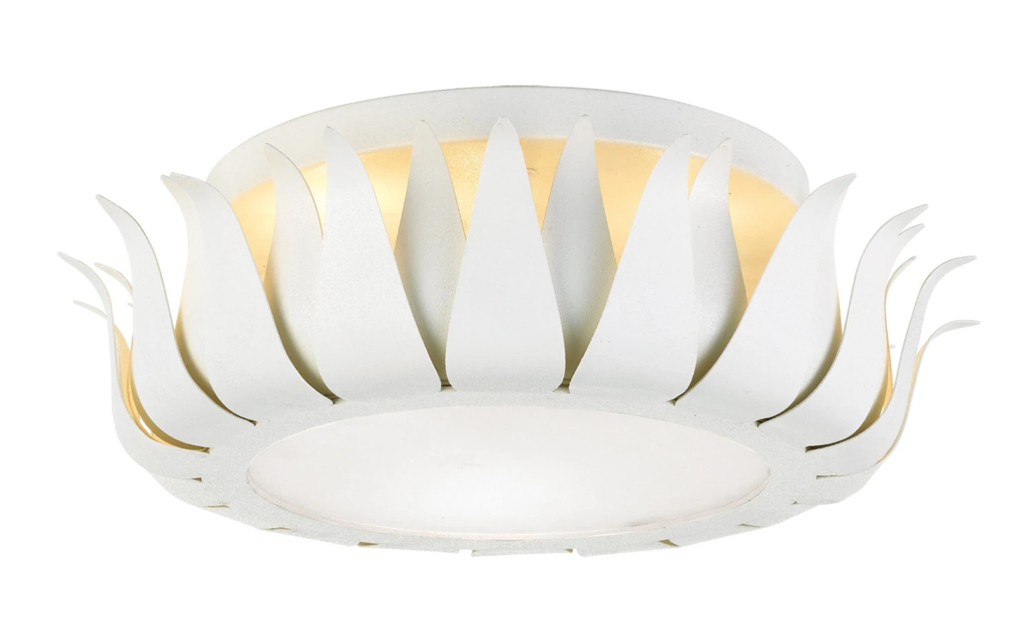 Blooming with matte white petals, this wrought iron flush mount offers a sense of luxury and refinement to its surroundings. The frosted glass diffuser softens the light. Hardwired.