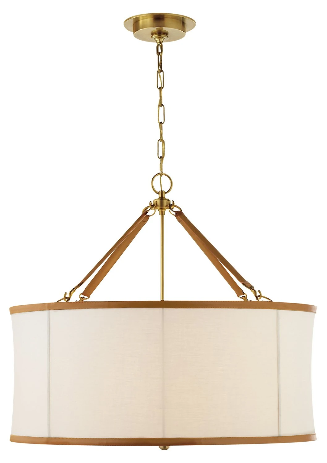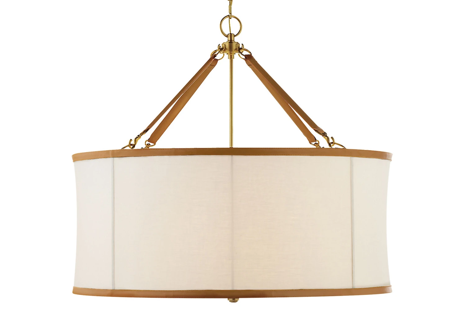 This equestrian-inspired hanging shade is crafted of linen with leather accents and brass detailing. Hardwired.