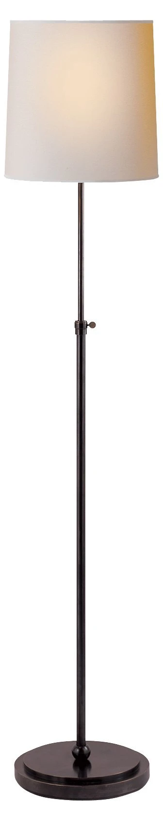 The classic shape and gleaming bronze finish of this floor lamp will bring elegance as well as light to a room. The lamp adjusts in height from 44 to 60 inches, which adds to its versatility. Topped with a paper shade.