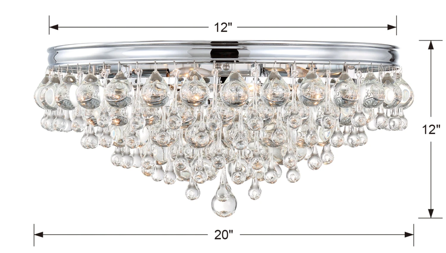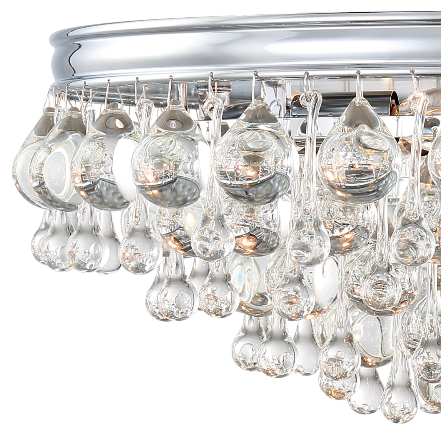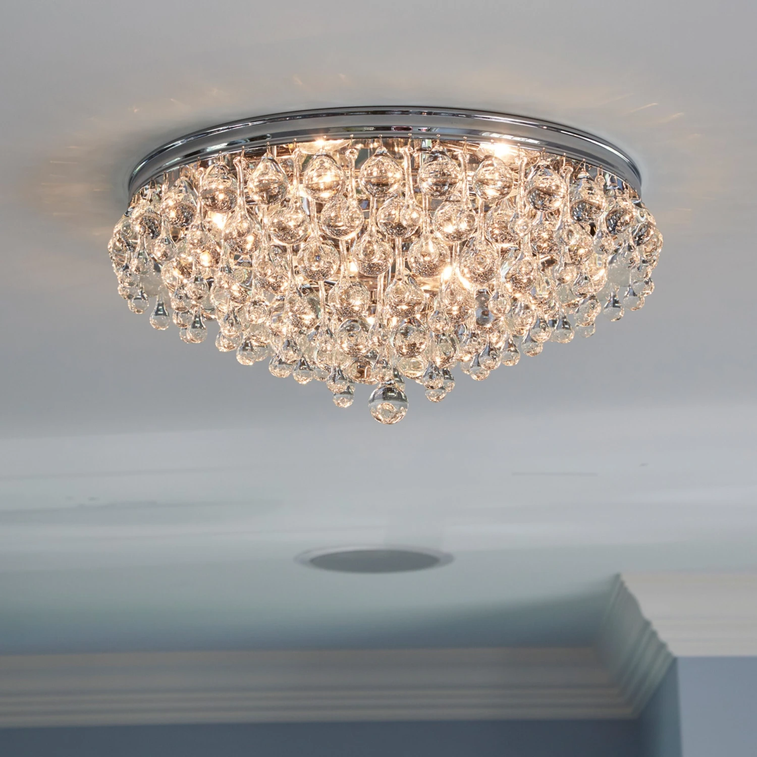 This glamorous flush mount glimmers with scores of clear glass balls and teardrops descending from a gleaming chrome fixture. Hardwired.