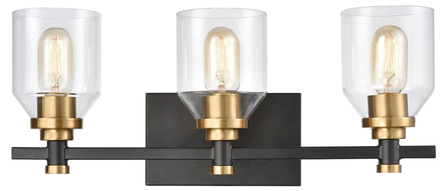 Exclusive to One Kings Lane: This three-light sconce makes an immediate impression with its clear glass shades and two-tone finish in matte black and satin brass. Because this item is damp rated, it can be used in any room of the home, including the bathroom. Hardwired.
