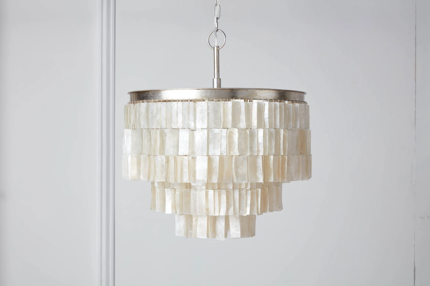Tiles crafted of translucent capiz shells dangle in tiers from this seven-bulb chandelier, ensuring a soft glow when the fixture is on and making this a showstopper even when it’s off.