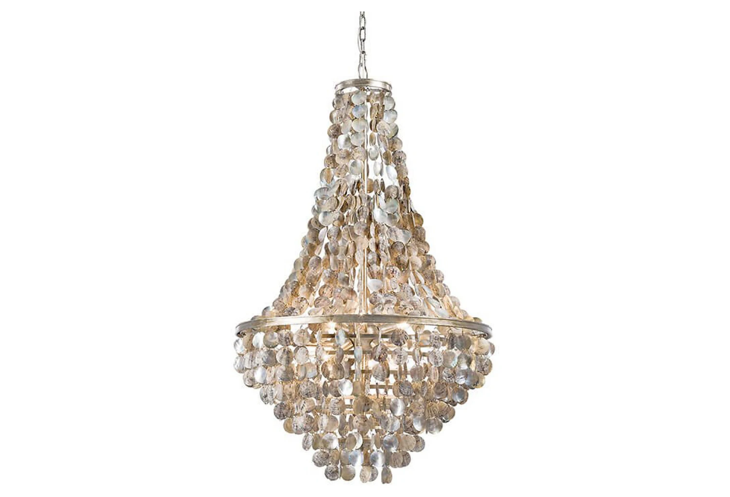A traditional chandelier shade is given a fresh, beachside feel with strands of natural shell. Add relaxed refinement to any space. Hardwired.