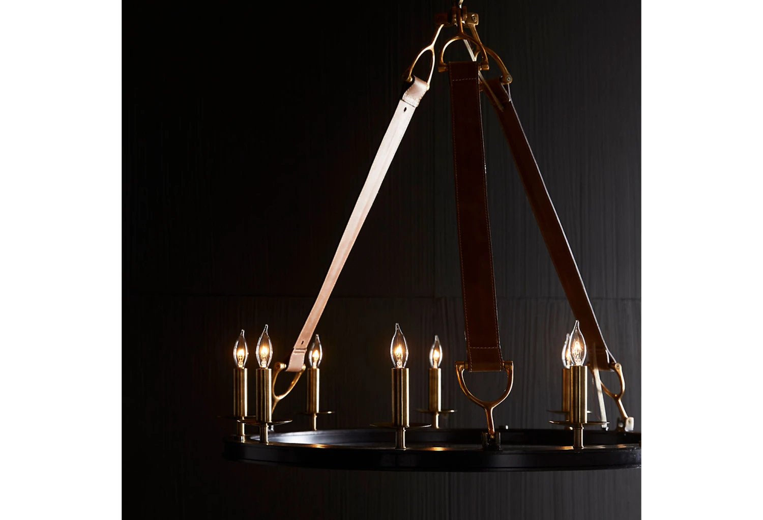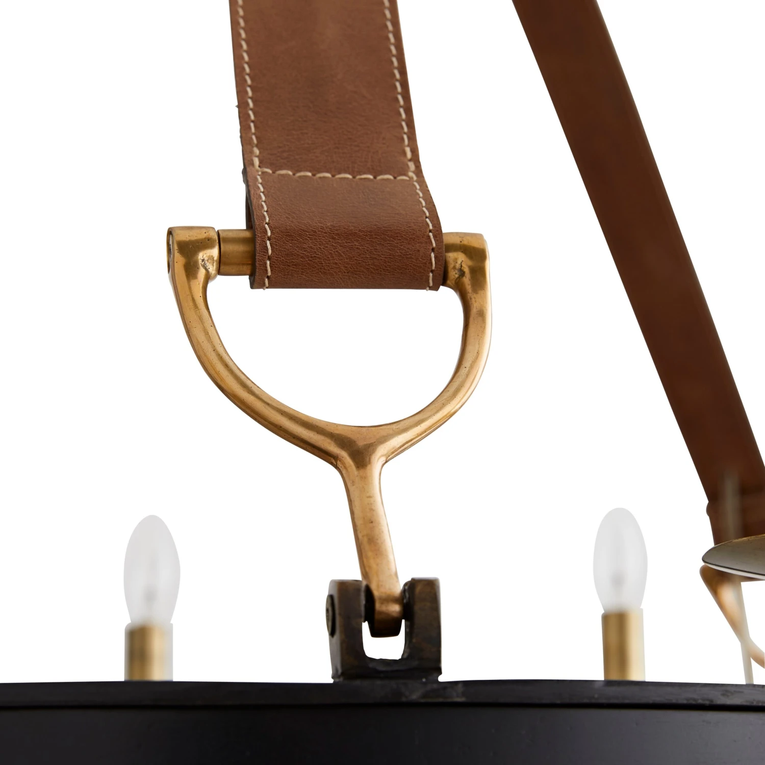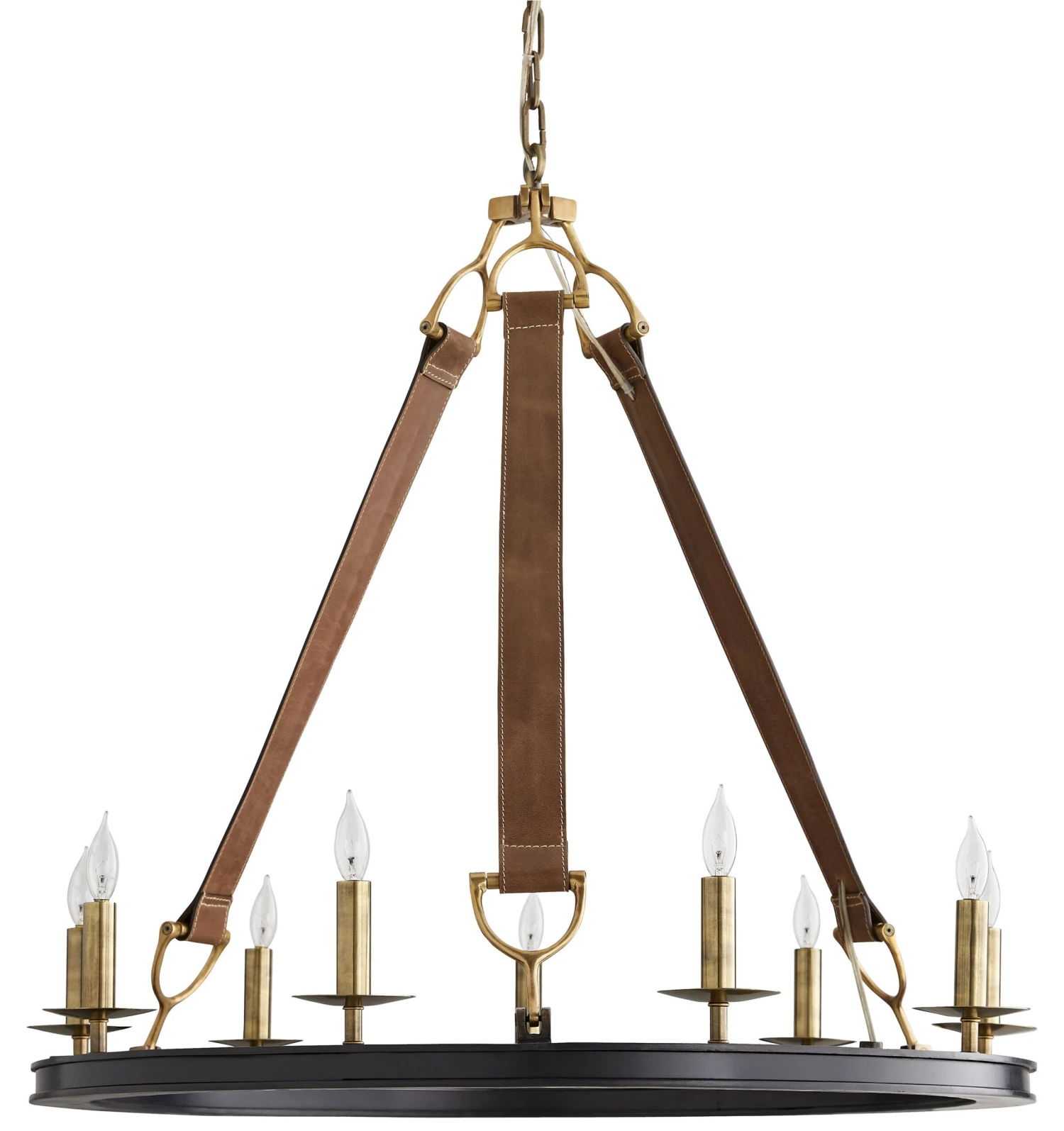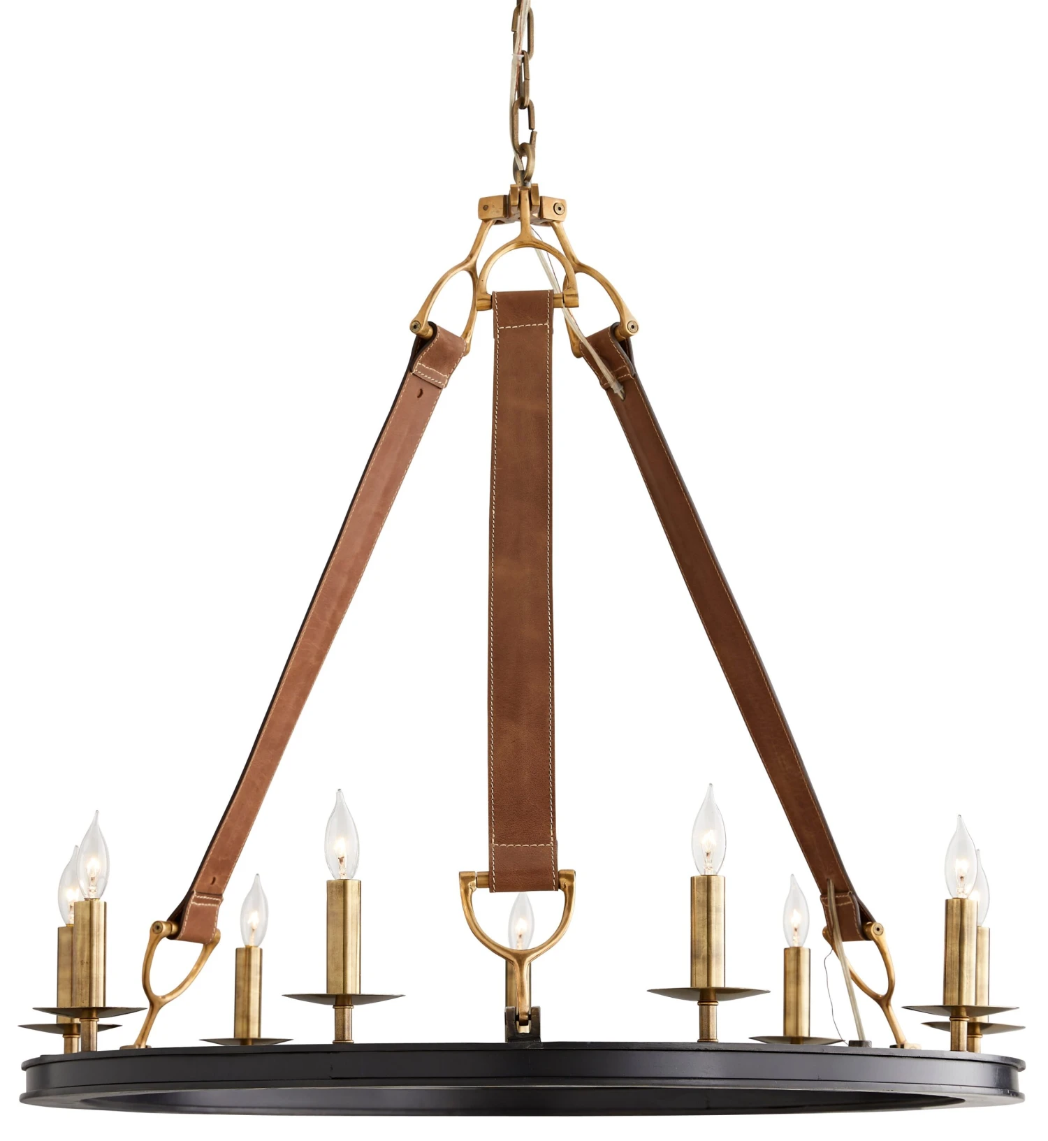 Detailed with antiqued brass stems and a hand-hammered iron ring suspended from three brown leather bands with bridle bit hardware, this chandelier adds an equestrian feel to a dining space or grand entryway. This piece is damp rated, which means it can also be used in bathrooms and covered outdoor areas. Hardwired. Bulbs not included.