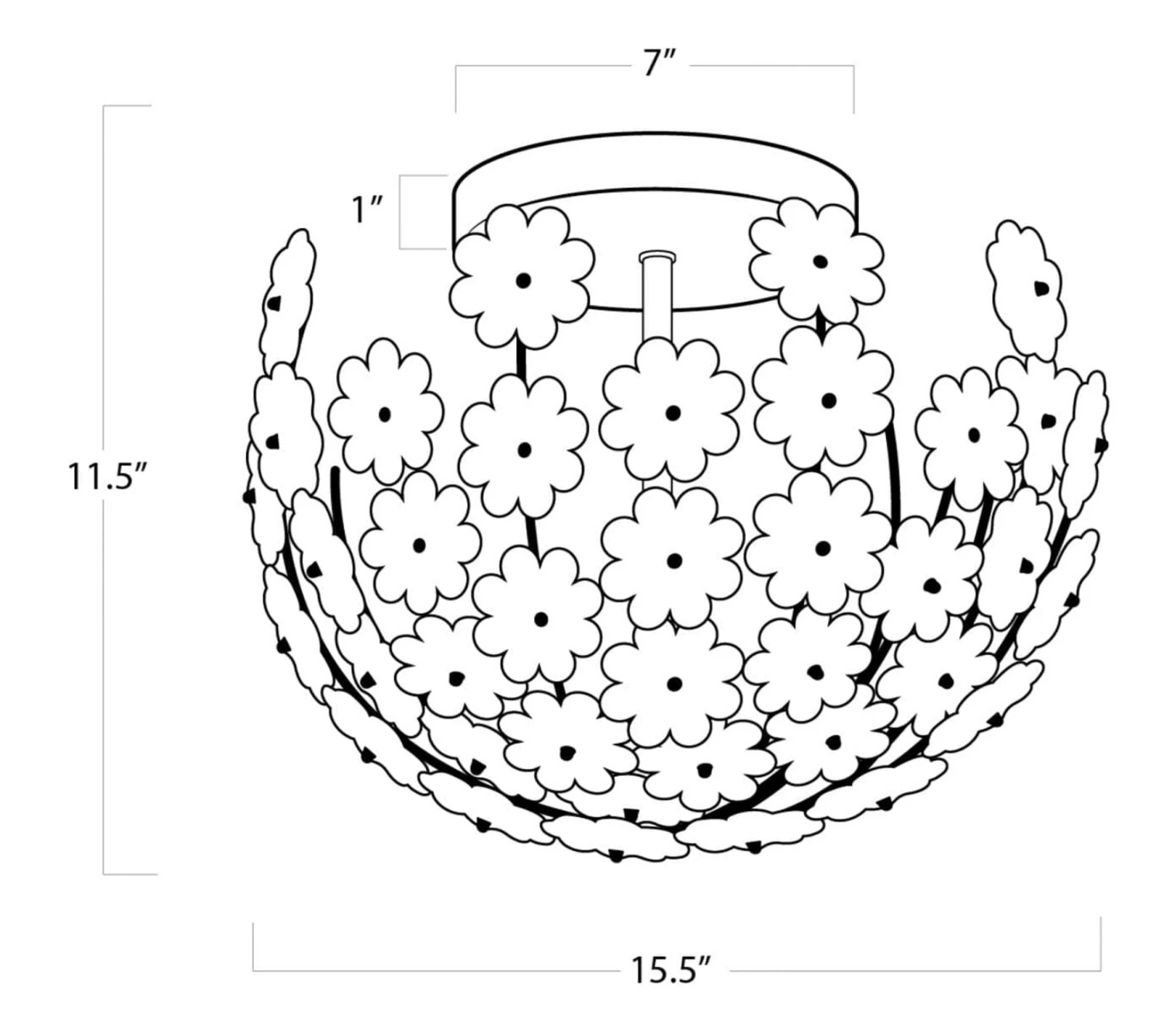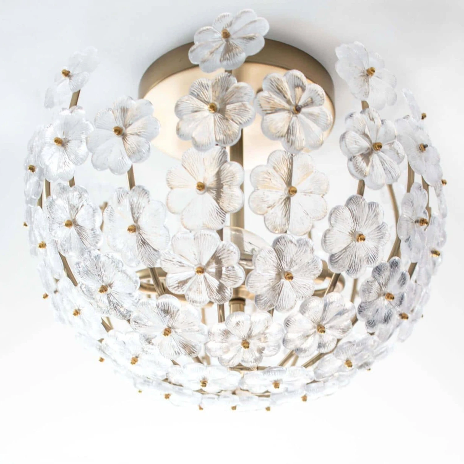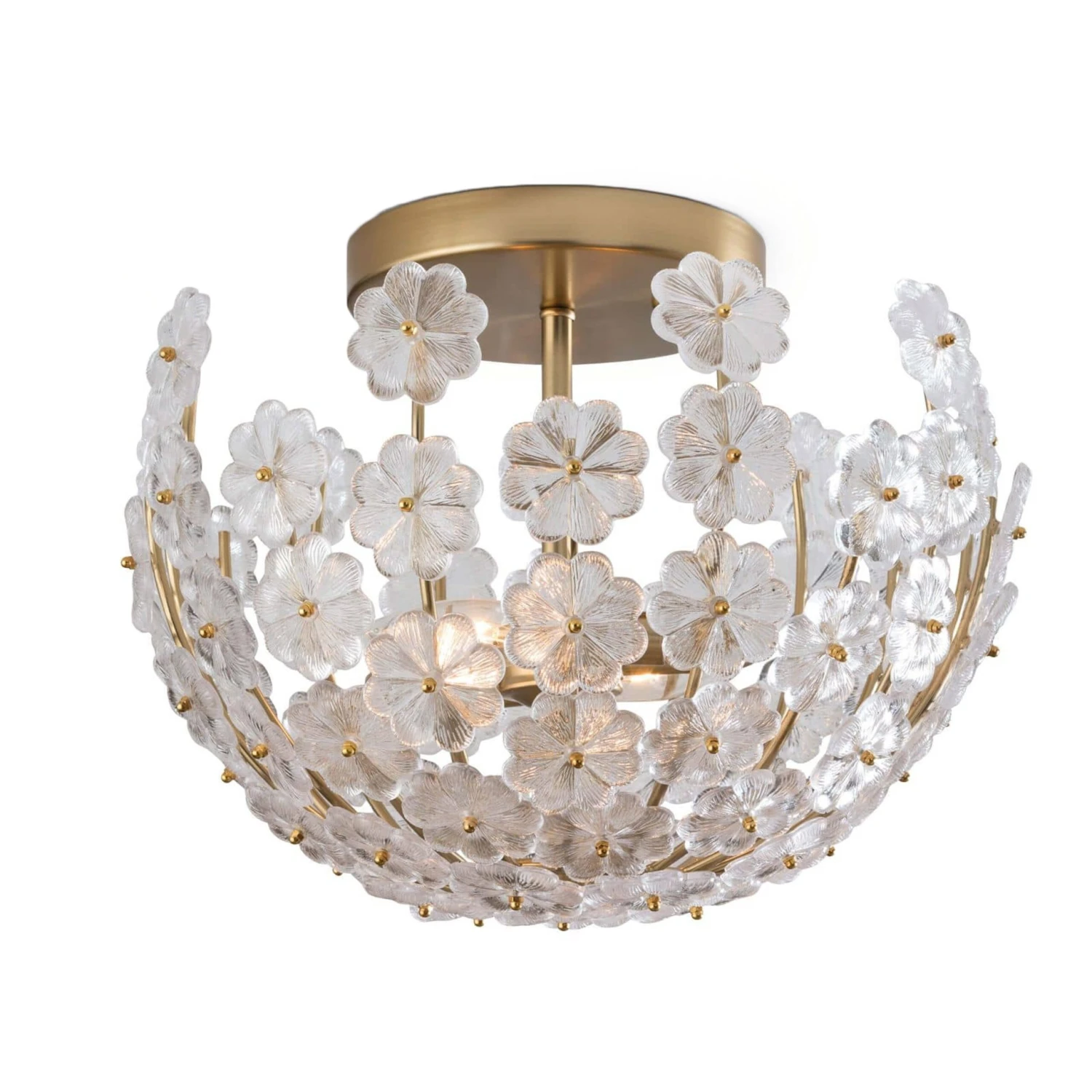 Crafted of steel with a natural brass finish and bevy of clear crystal flowers, this semi-flush mount fixture adds a refreshing, spirited note to any space. Hardwired.