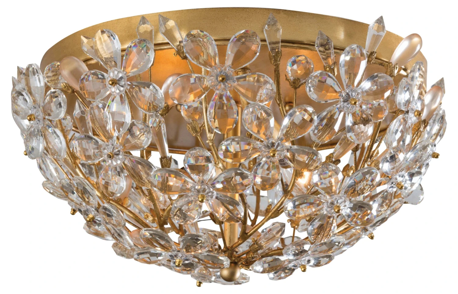 Crafted of steel with a gold-leaf finish and bevy of clear crystal flowers, this fixture adds a refreshing, spirited note to any space. Hardwired.