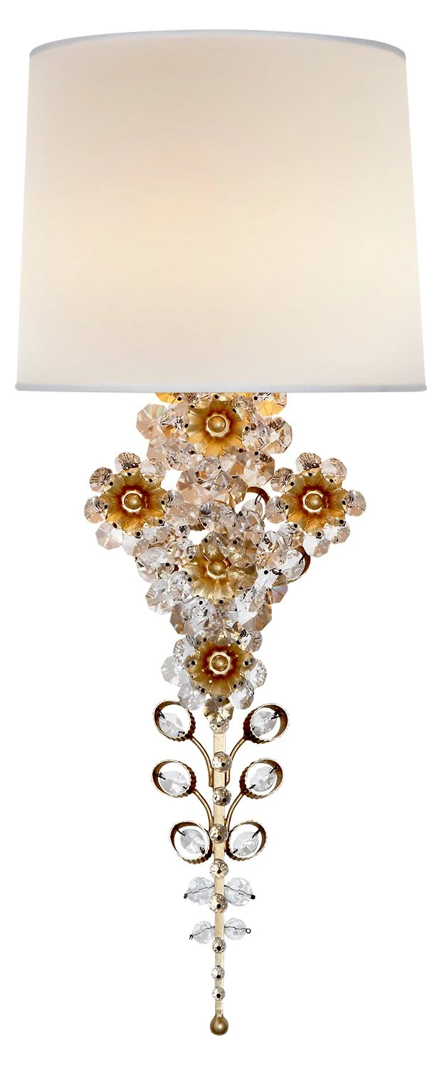 Dress the wall in decadence with this sconce, lavishly embellished with crystal blooms against a gilded backplate. Hardwired.