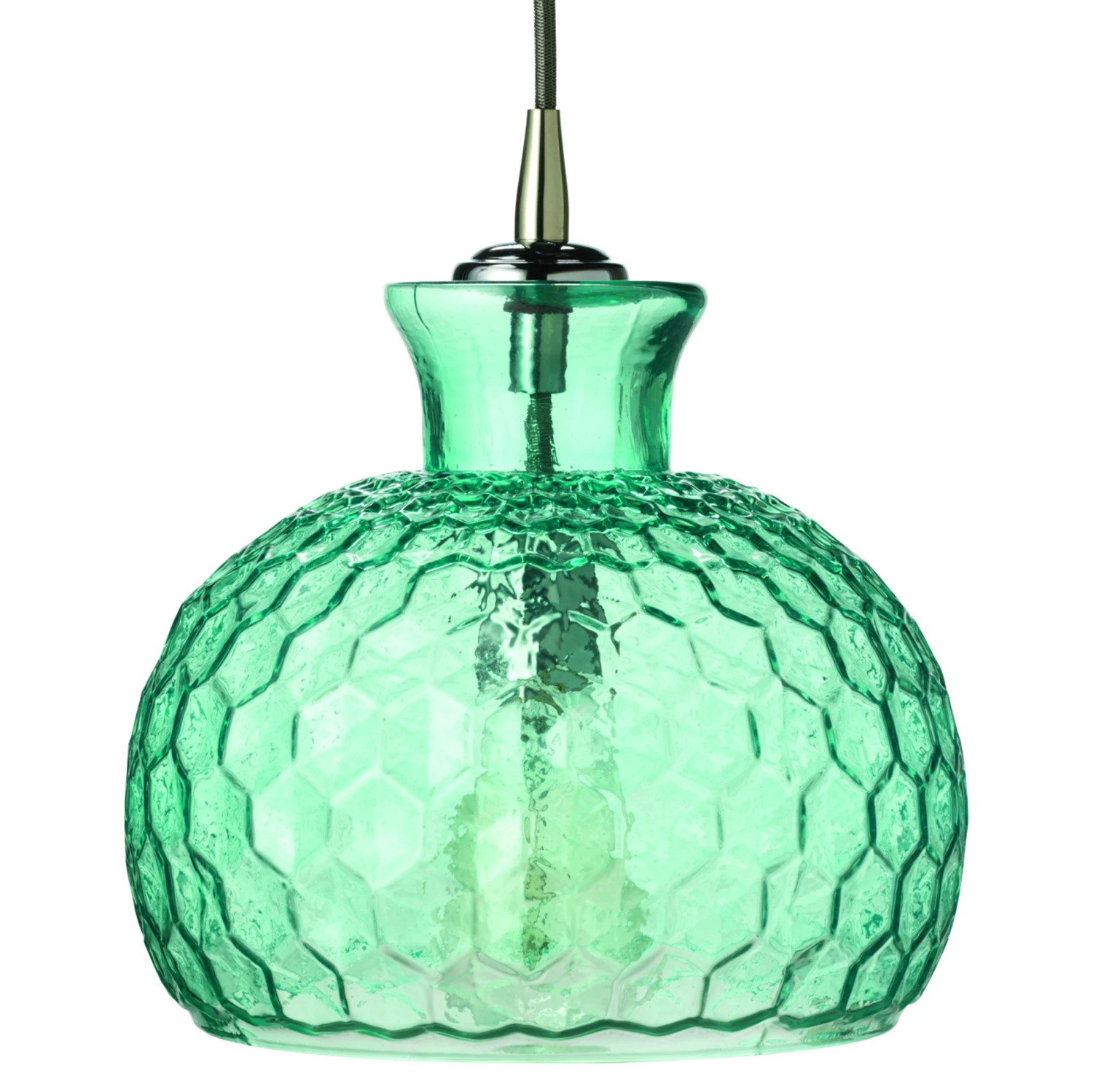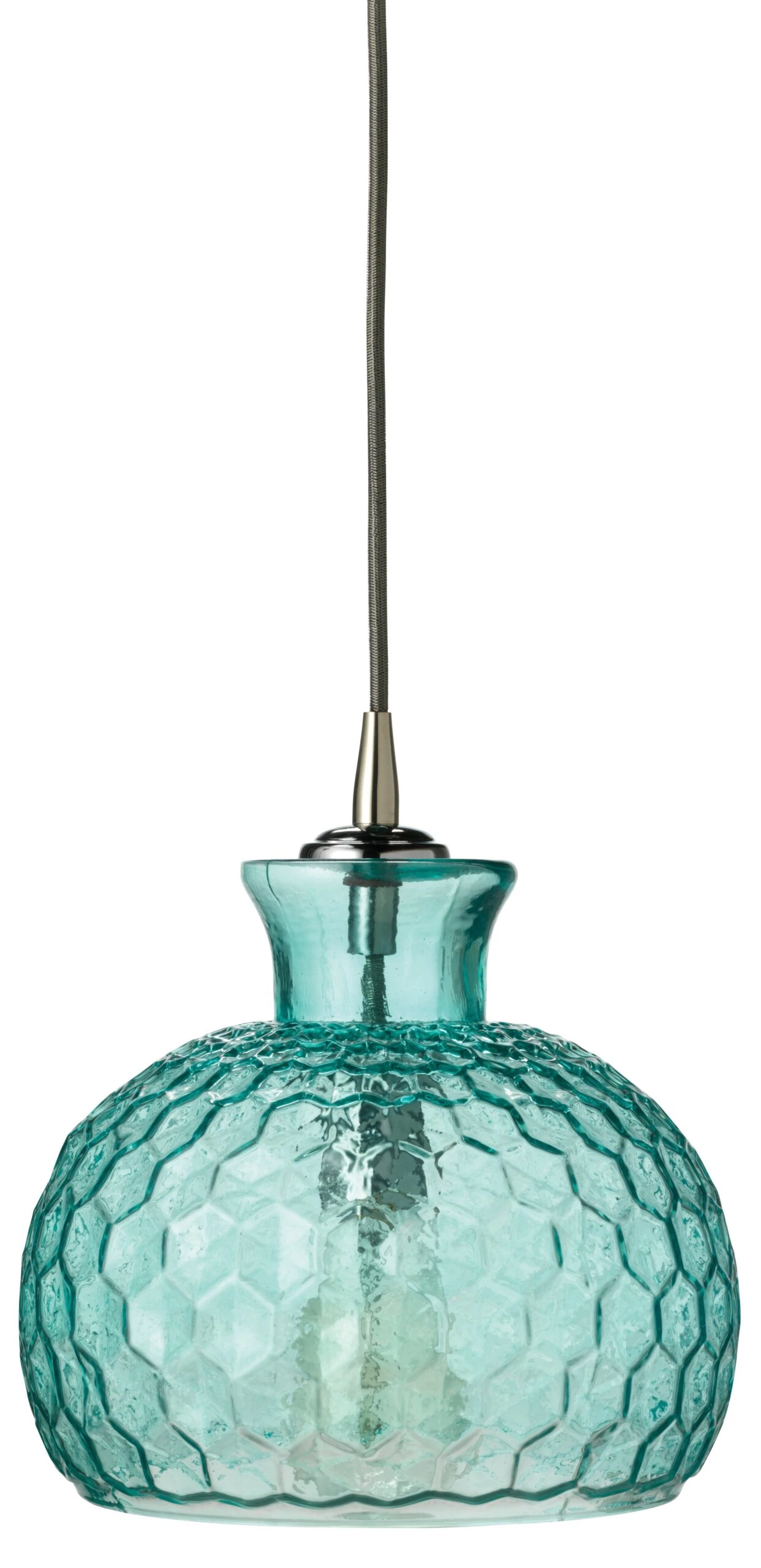 A honeycomb pattern adds extra shine and dimension to this pendant’s aqua glass shade. Hardwired.