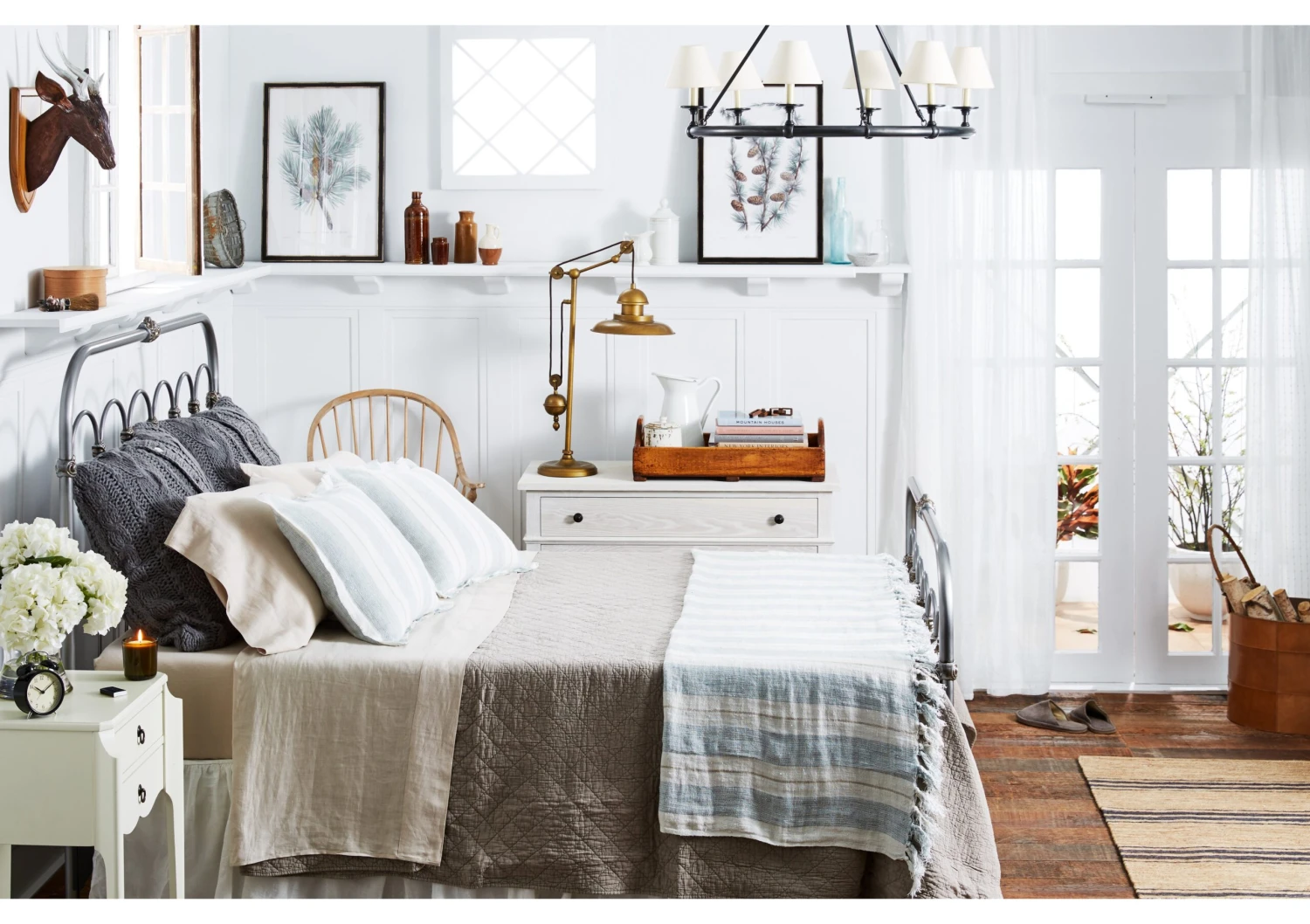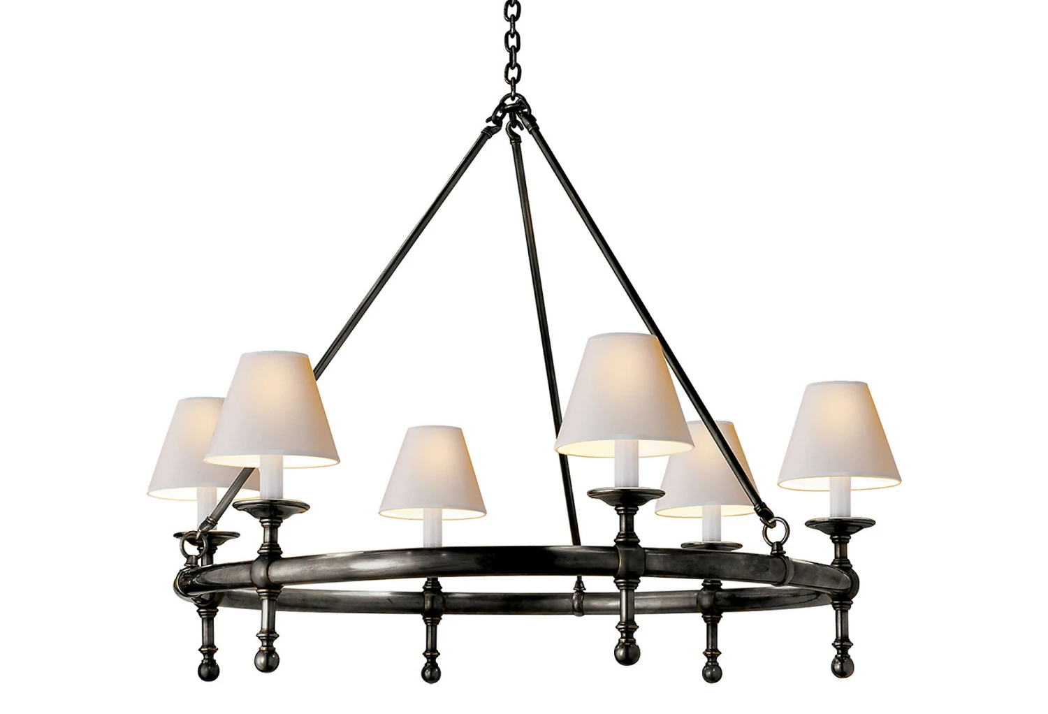 This ring-shaped chandelier bridges traditional and contemporary with its deep bronze finish, paper shades, and graceful candlestick-inspired fixtures. Hardwired.