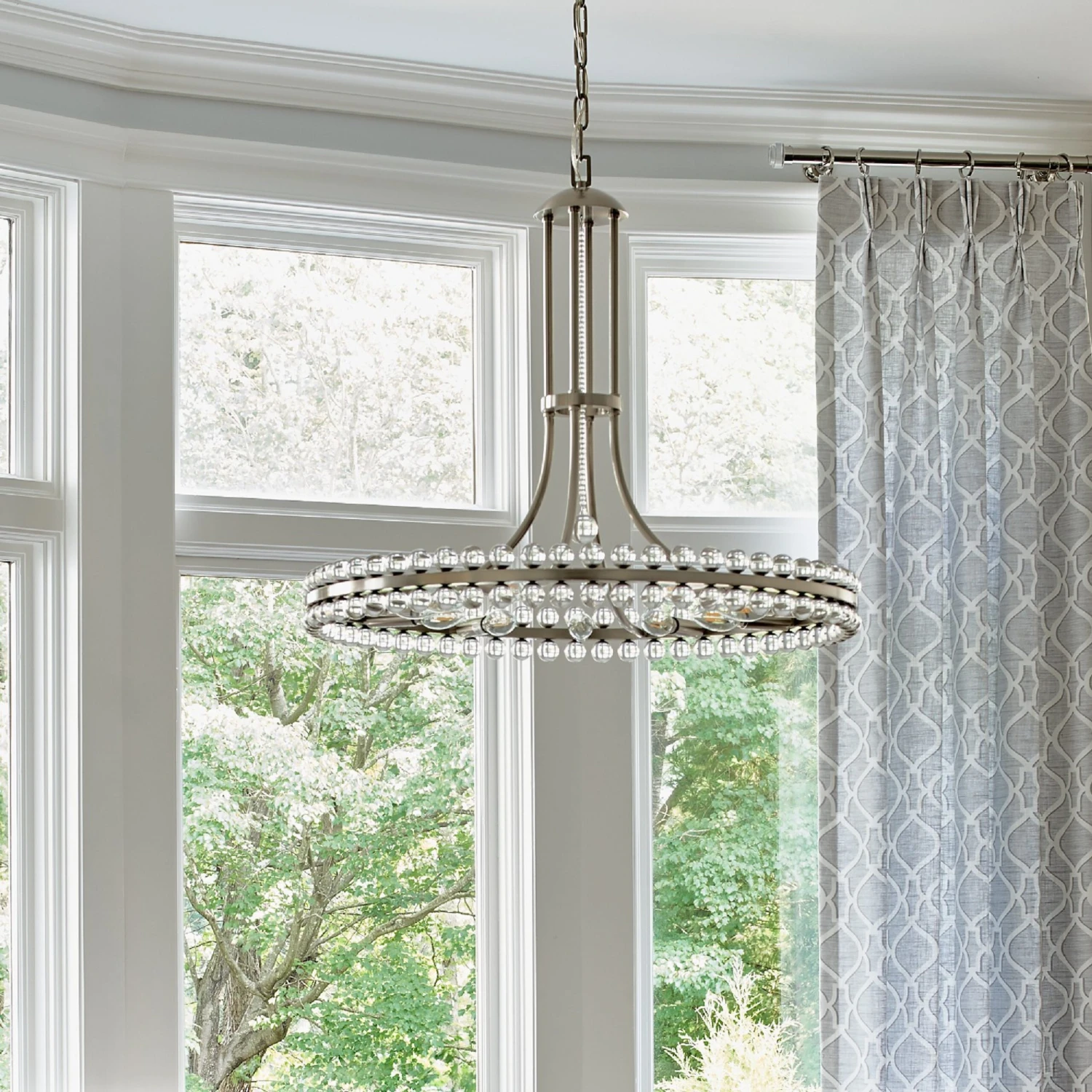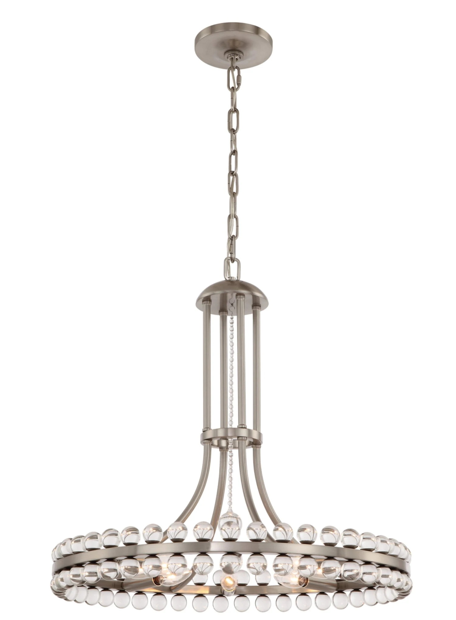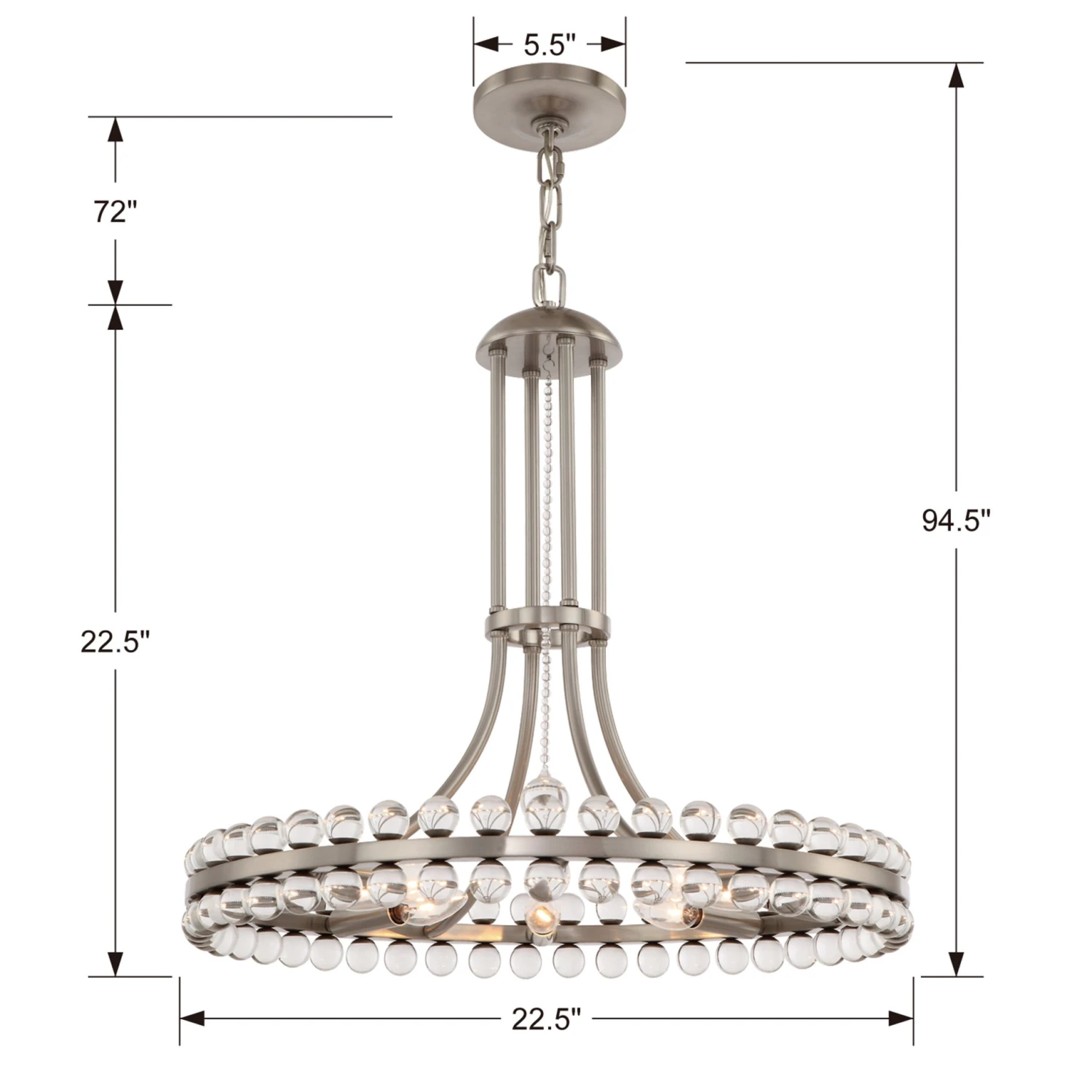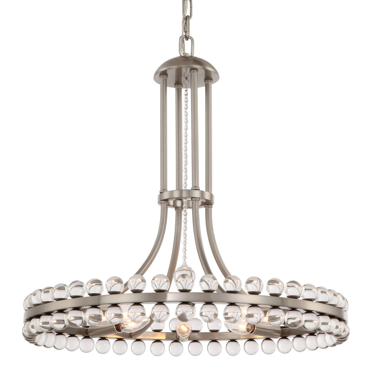 This glamorous chandelier glimmers with scores of clear glass spheres descending from the brushed nickel-finished fixture. Hardwired.