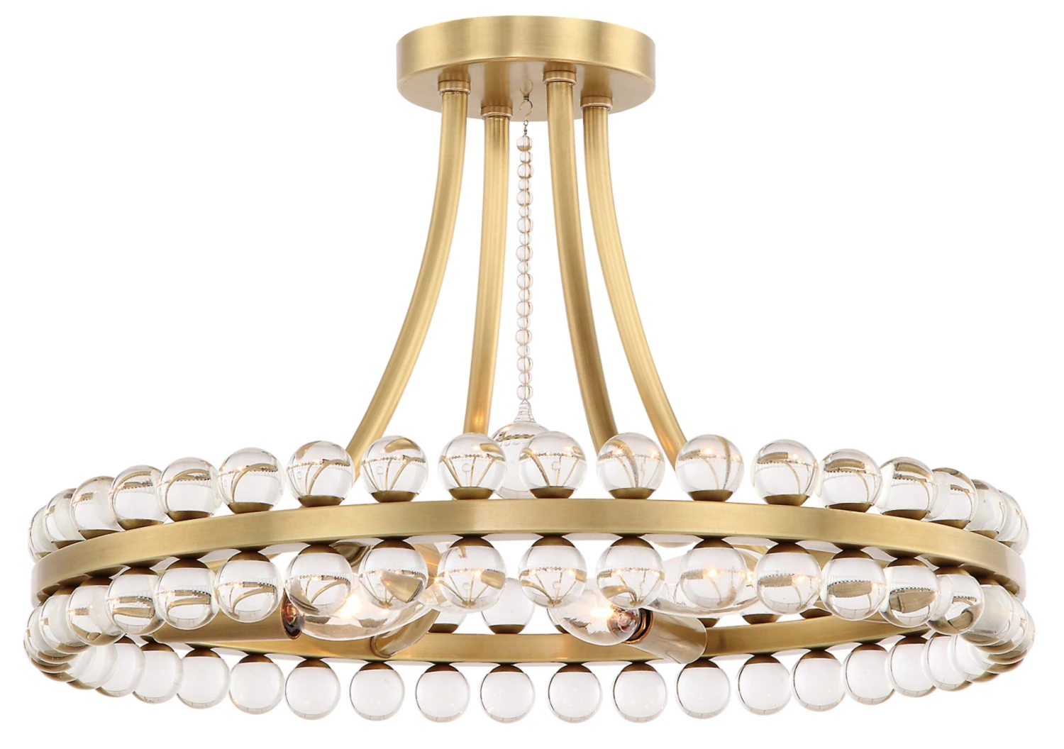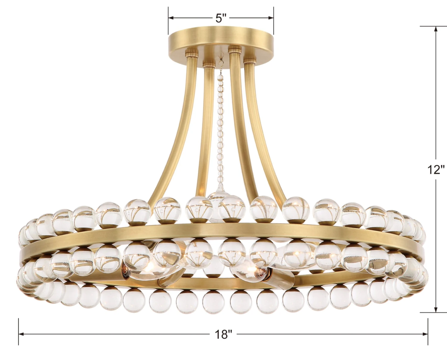 This glamorous flush mount glimmers with scores of clear glass spheres descending from the aged brass-finished fixture. Hardwired.