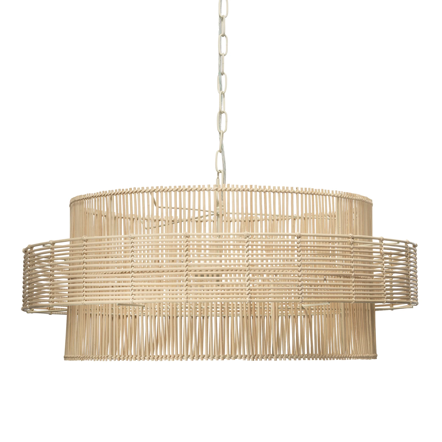 The overlapping vertical and horizontal rattan strips are especially striking when this two-bulb pendant is on. Even when it’s not illuminated, however, this light fixture adds organic elegance to its surroundings.