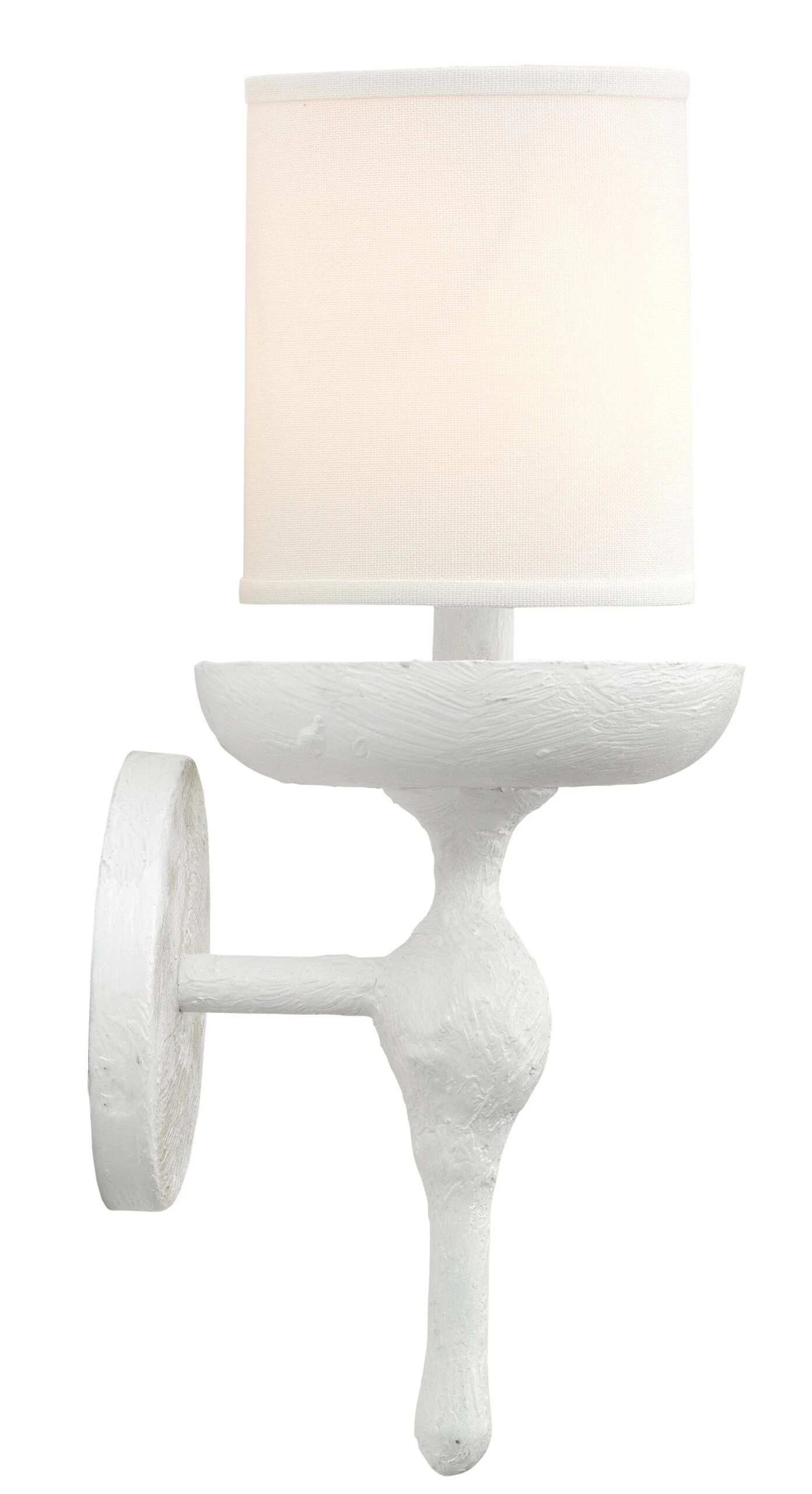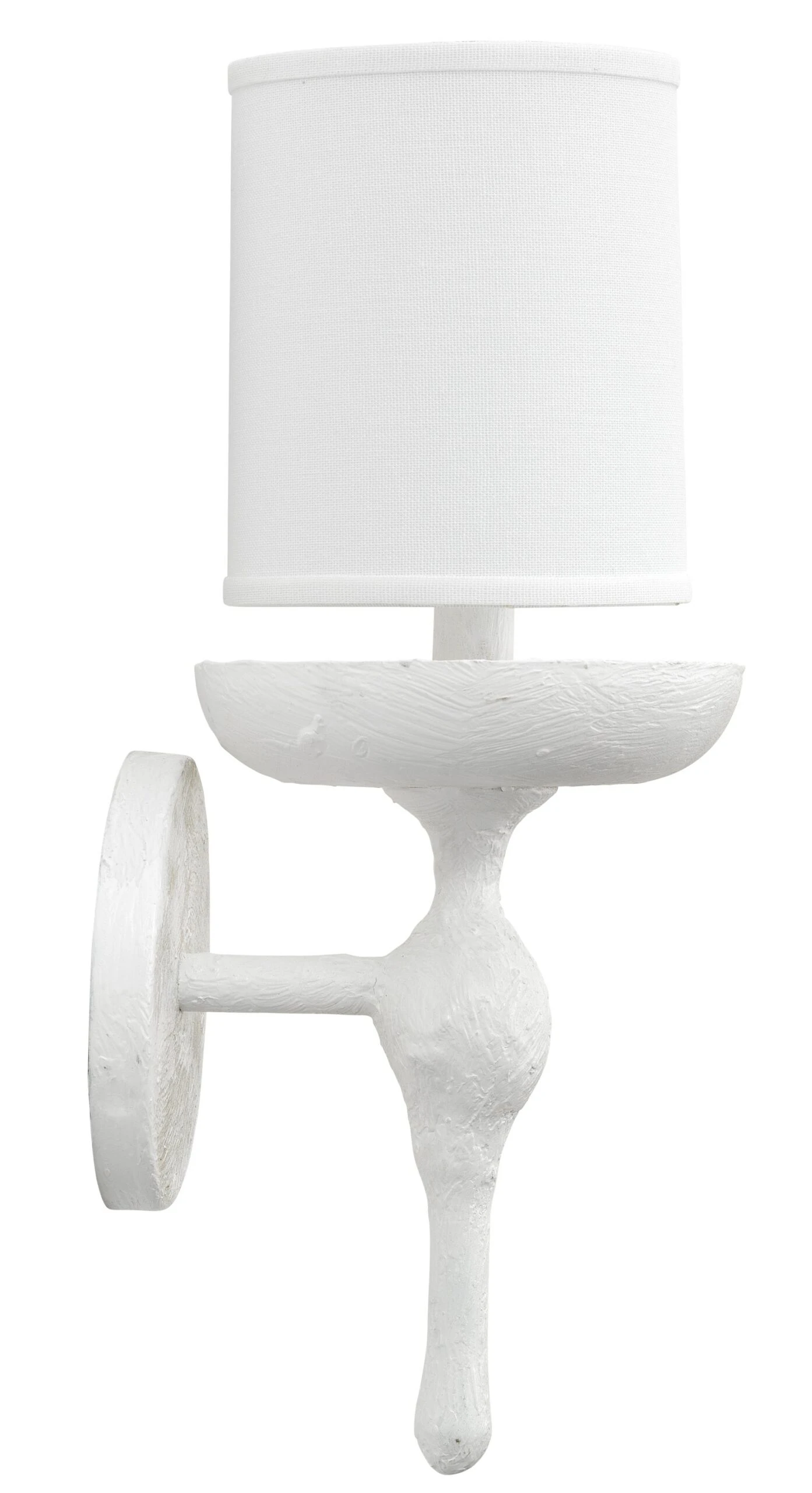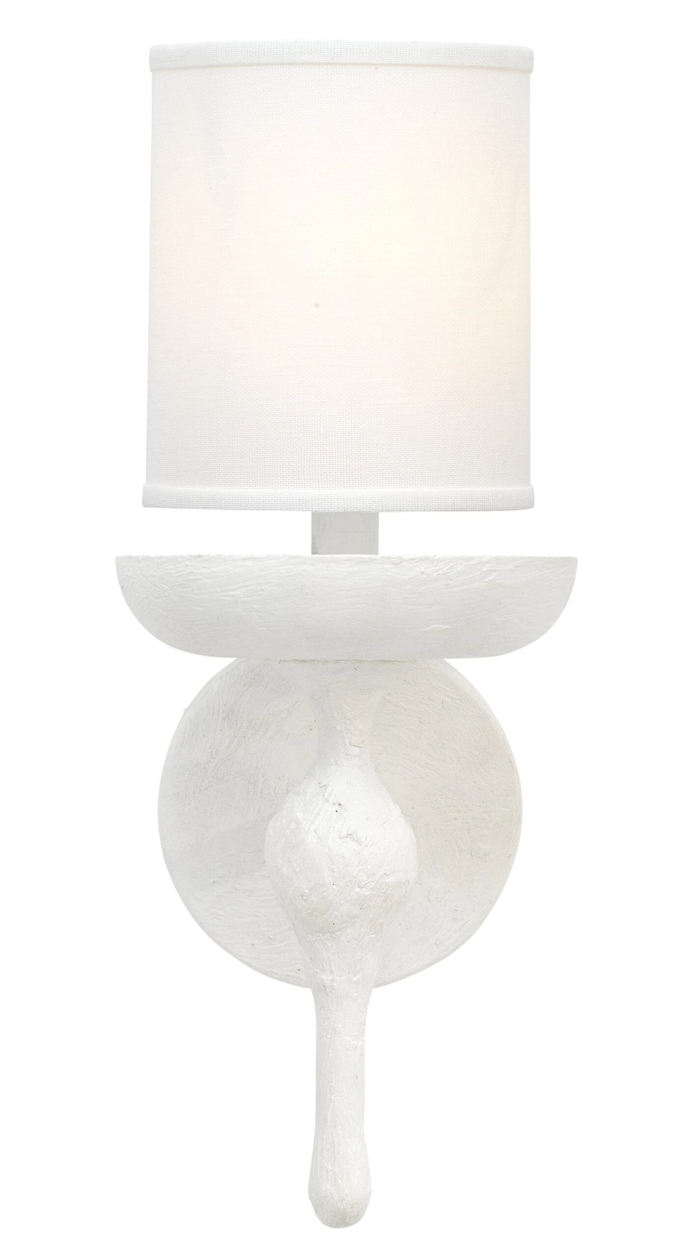 A traditional silhouette meets our coastal roots. This white plaster coated wall sconce creates stunning lighting with a casual texture. The grit of the plaster gives this otherwise formal sconce an approachable aesthetic. Hardwired.