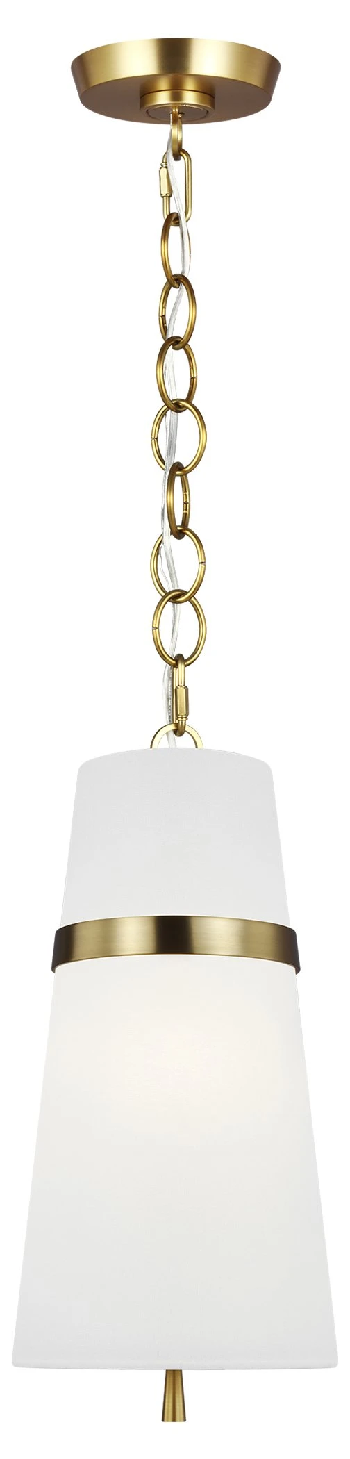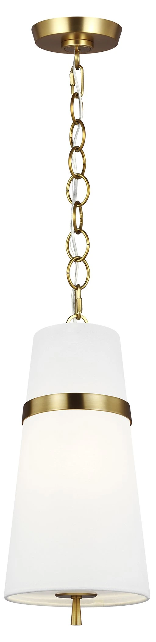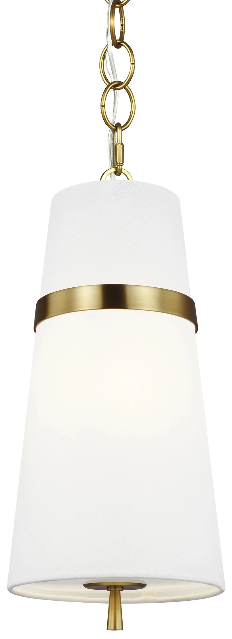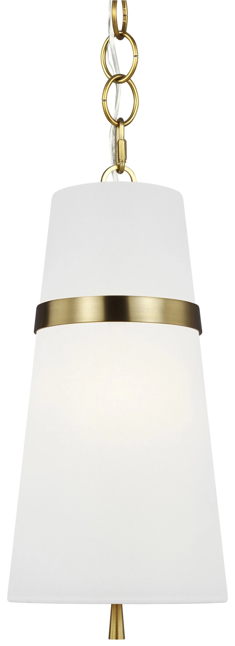 A bell-shaped linen shade makes a refined statement on this ultramodern pendant, suspended from a banded fixture finished in burnished brass. Hardwired.