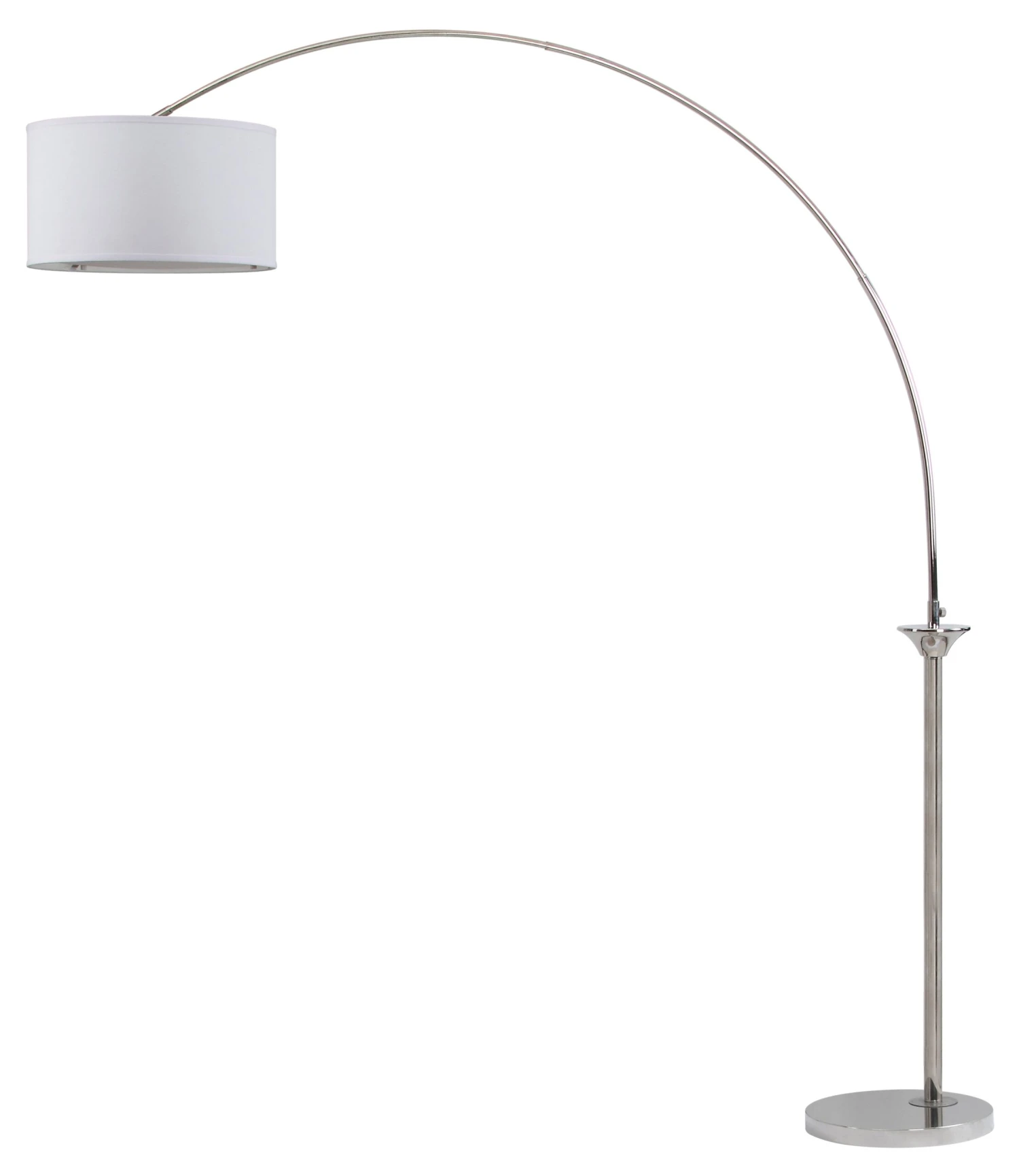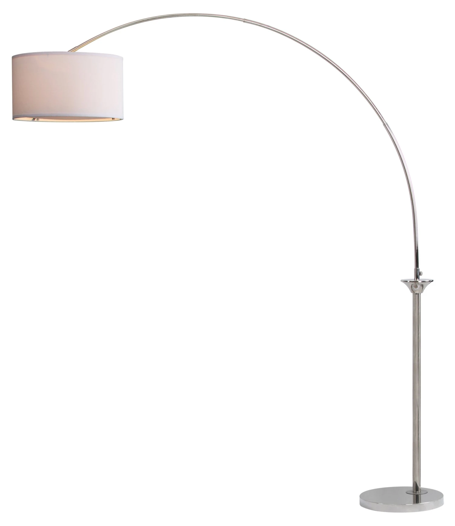 This floor lamp’s dramatically arching iron arm extends gracefully from a simple, polished base. An ideal choice for a reading nook, living room, or next to a desk, it’s finished with a white cotton drum shade.