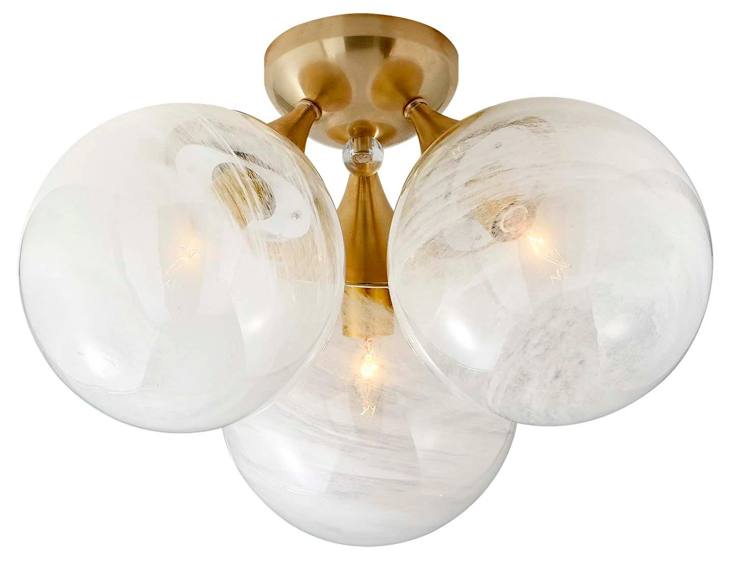 Putting a stylish spin on the classic ceiling mount, this fixture features a three strie glass globe shades affixed to a hand-rubbed, antiqued brass body. Because this fixture is damp rated, you can use it covered outdoor areas as well as indoors. Hardwired.