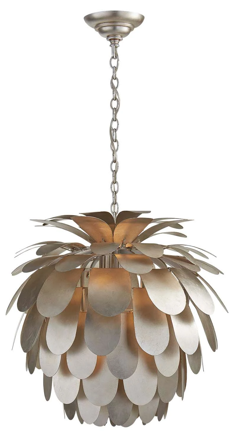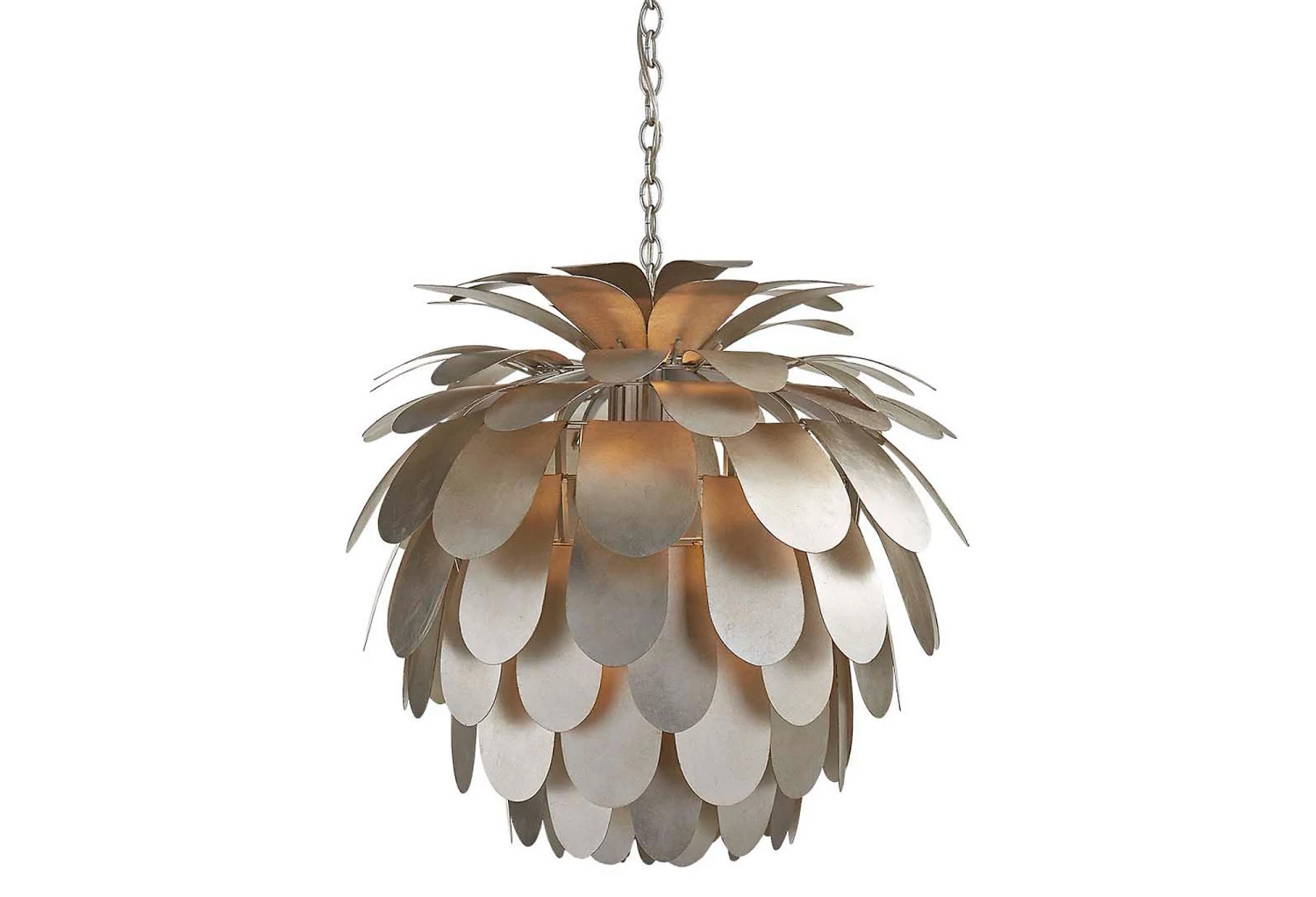 Designed by E. F. Chapman, this pendant celebrates whimsy and structure with a bounty of brass petals in burnished silver leaf that cast a soft glow from within. Hardwired.