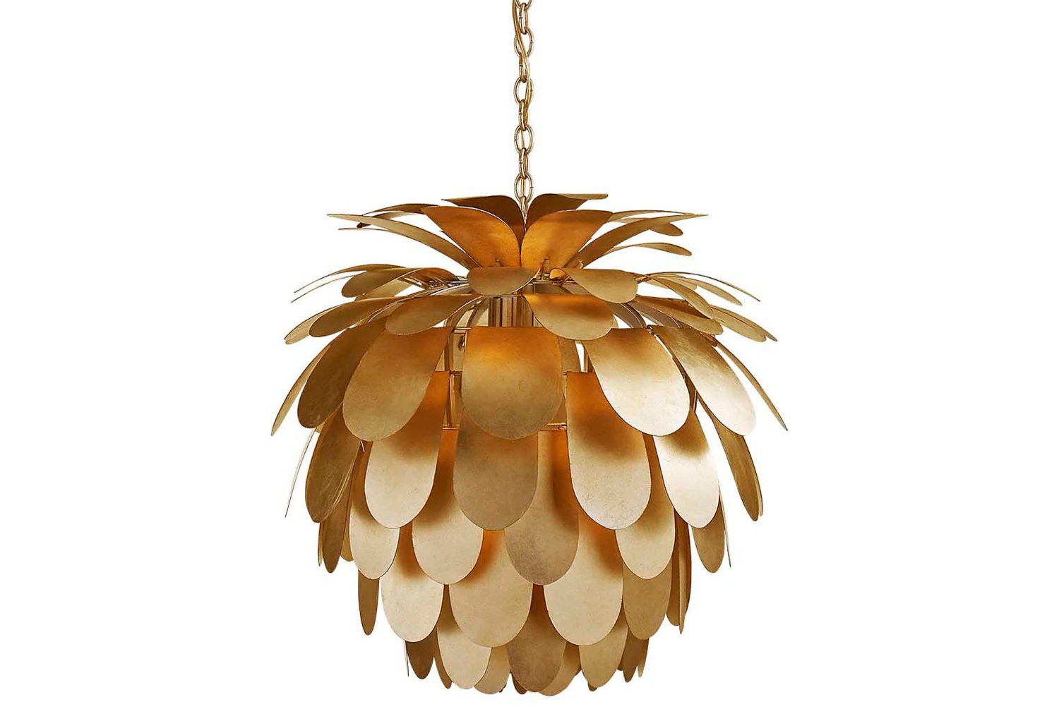 Designed by E. F. Chapman, this pendant celebrates whimsy and structure with a bounty of gilded brass petals that cast a soft glow from within. Hardwired.