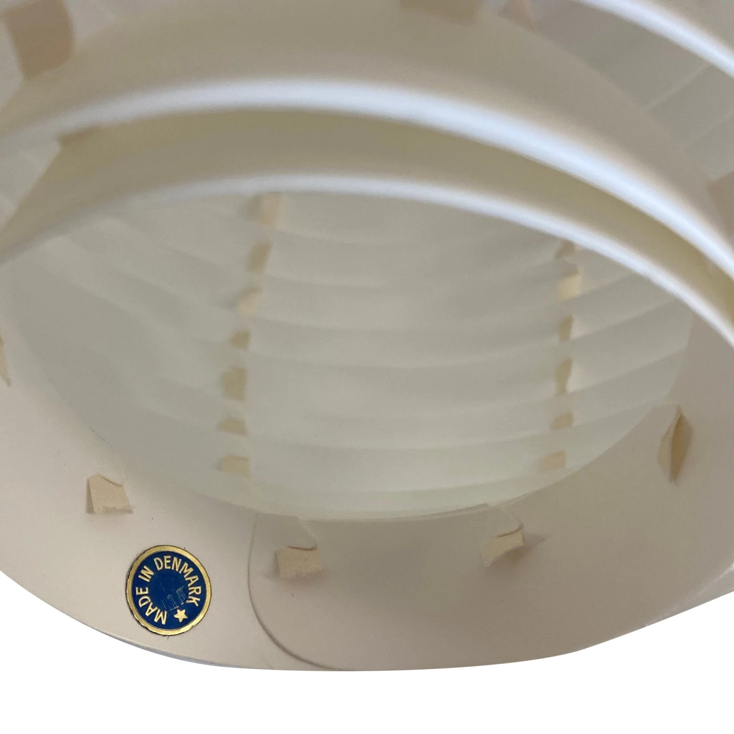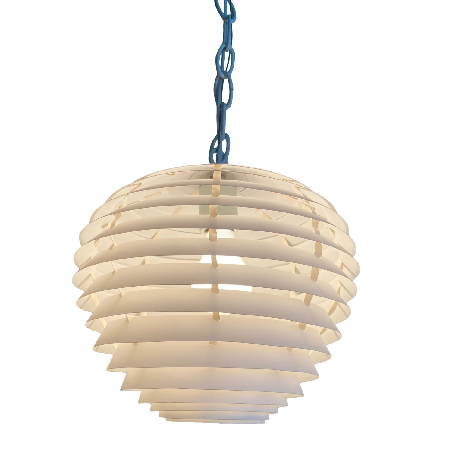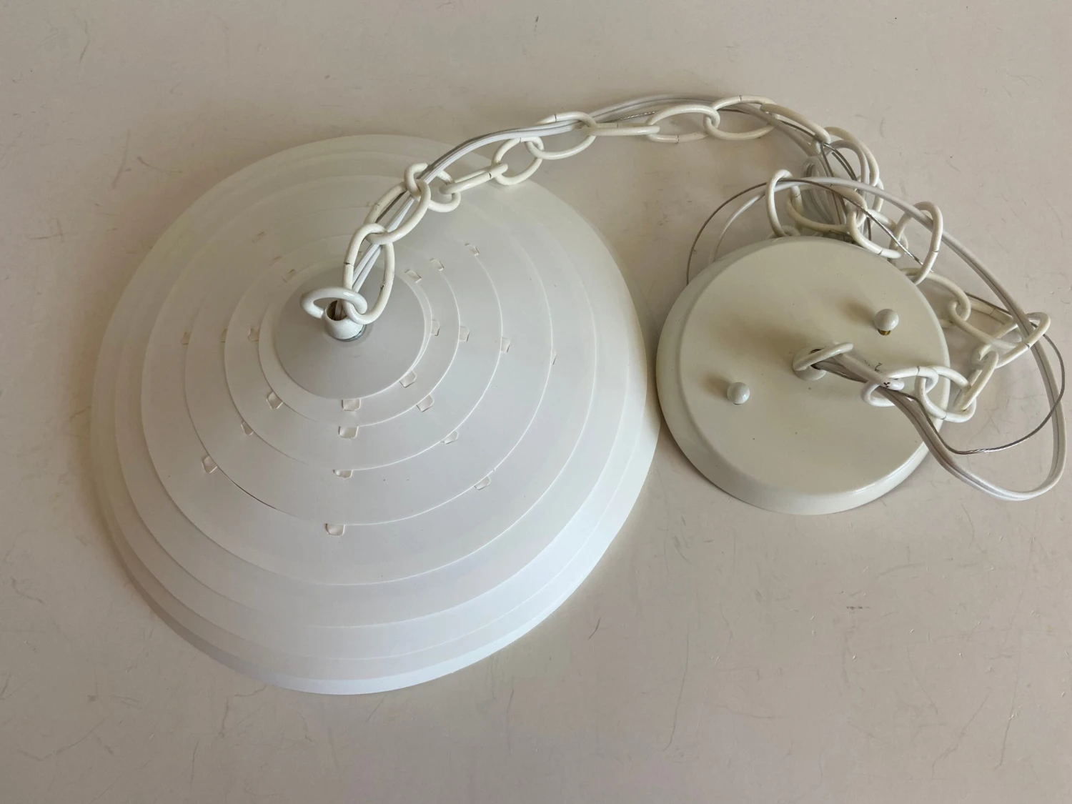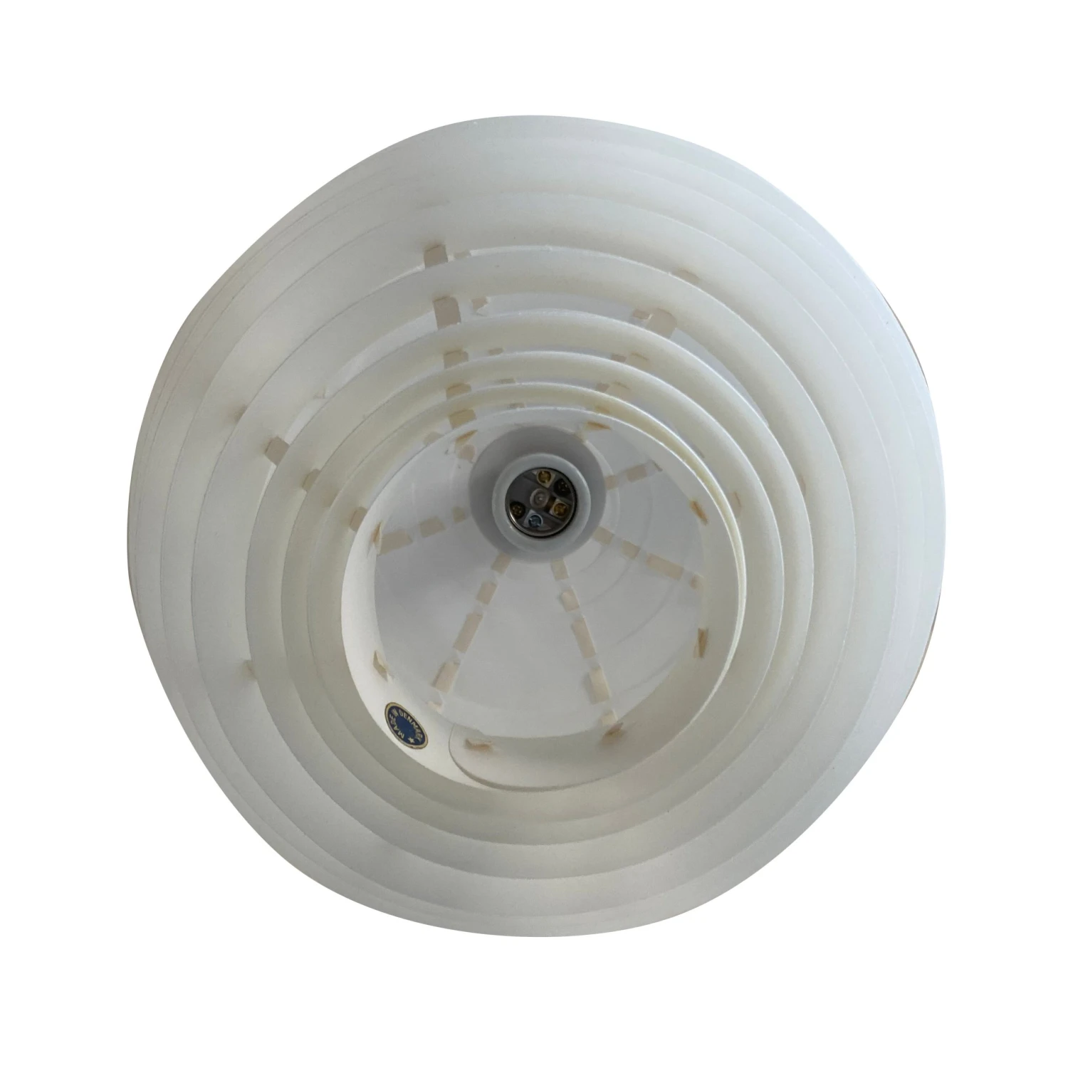 1960s Danish modern pendant light by Kokon, Denmark featuring a tiered and louvered vinyl shade with one light. Retains original label and box. Newly wired with new porcelain socket for one standard bulb. Comes ready to install with a 36’L adjustable chain and ceiling canopy. Light finish wear.