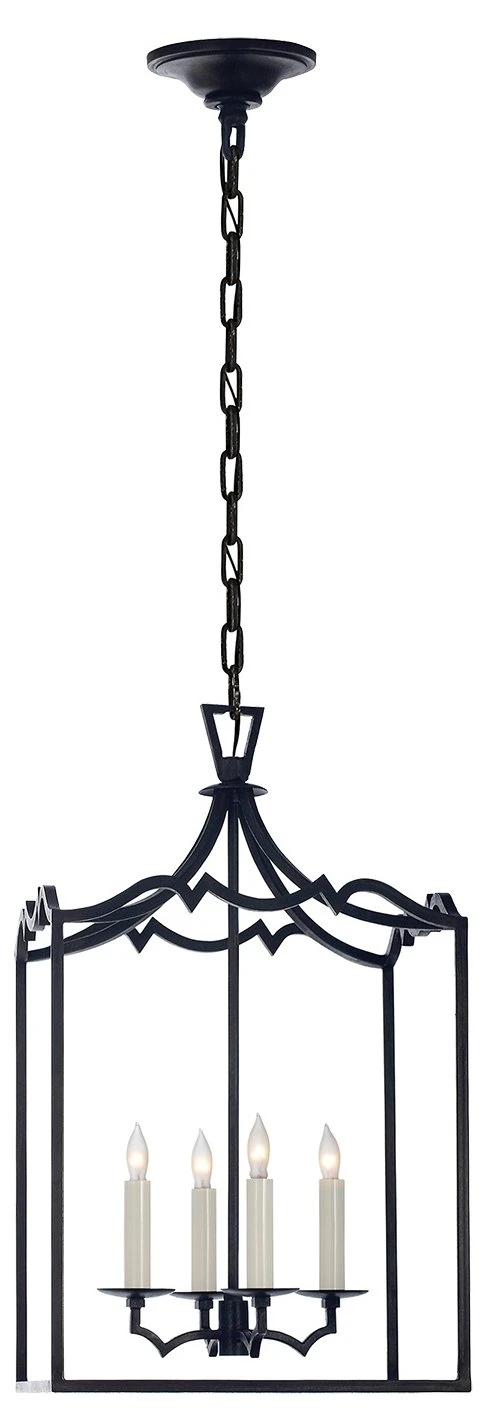 Detailed with barbed, open framework and a suspended candelabra, this aged iron lantern exudes a light, graceful feel. Holds four candelabra bulbs. Hardwired.