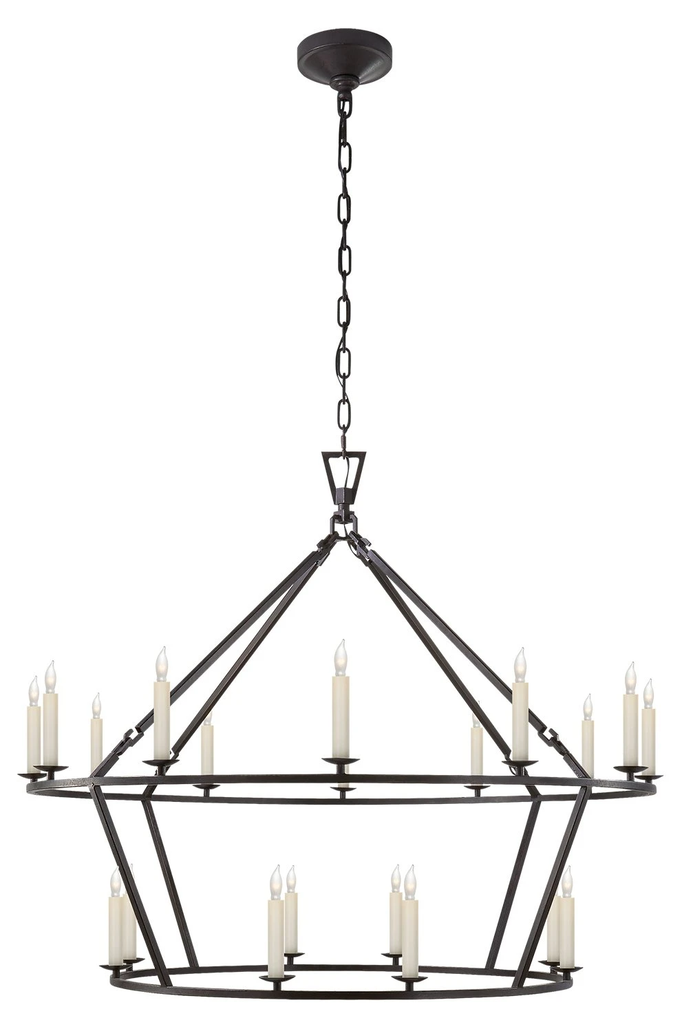 The open, airy iron frame of this large two-tiered ring chandelier brings depth and structure to any space. Sealed in an aged iron finish for added luster. Hardwired.