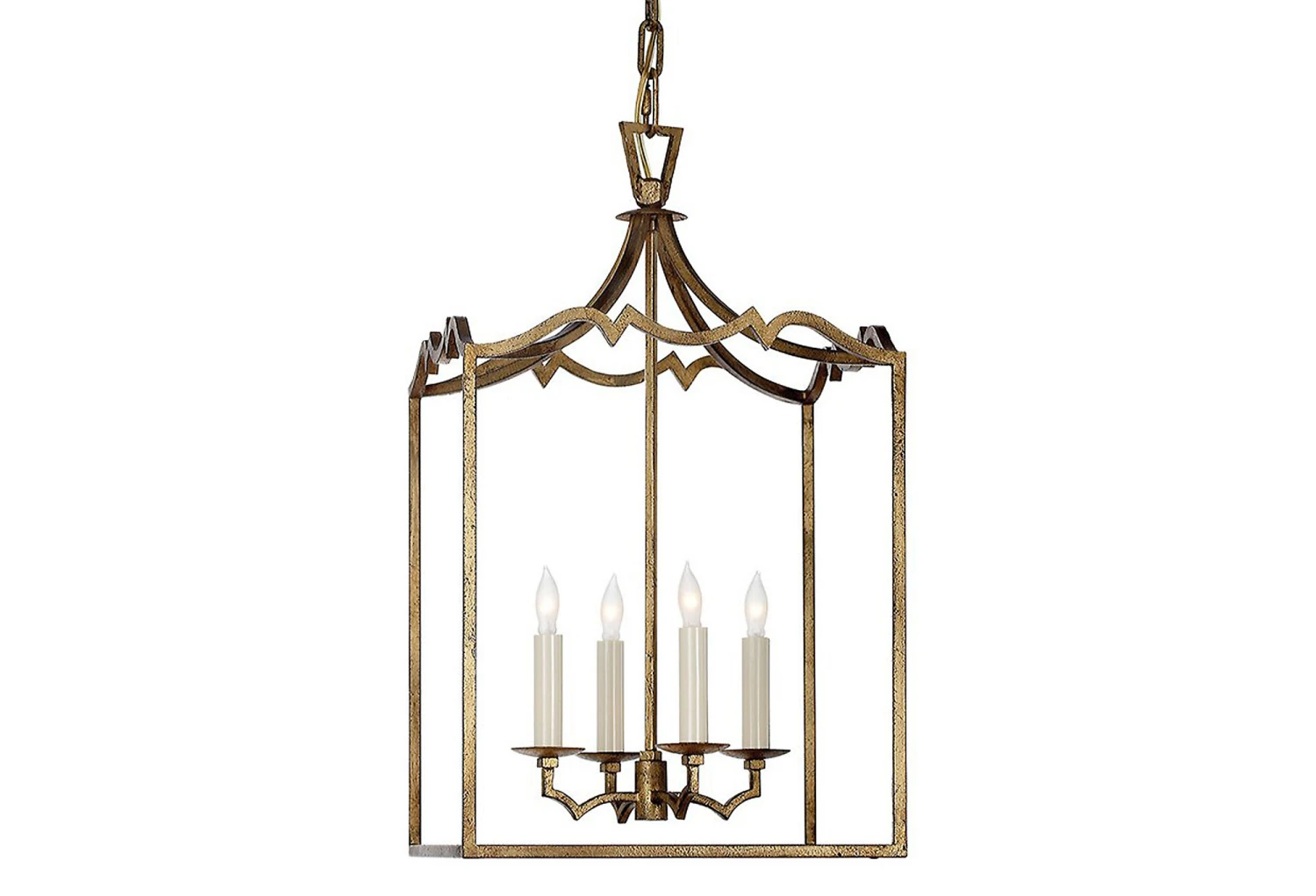 Crafted from beautifully gilded copper-and-zinc, this lantern will give any room a warm and welcoming glow. Holds four candelabra bulbs. Hardwired.