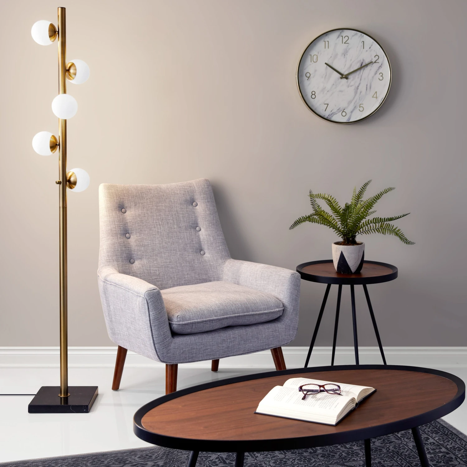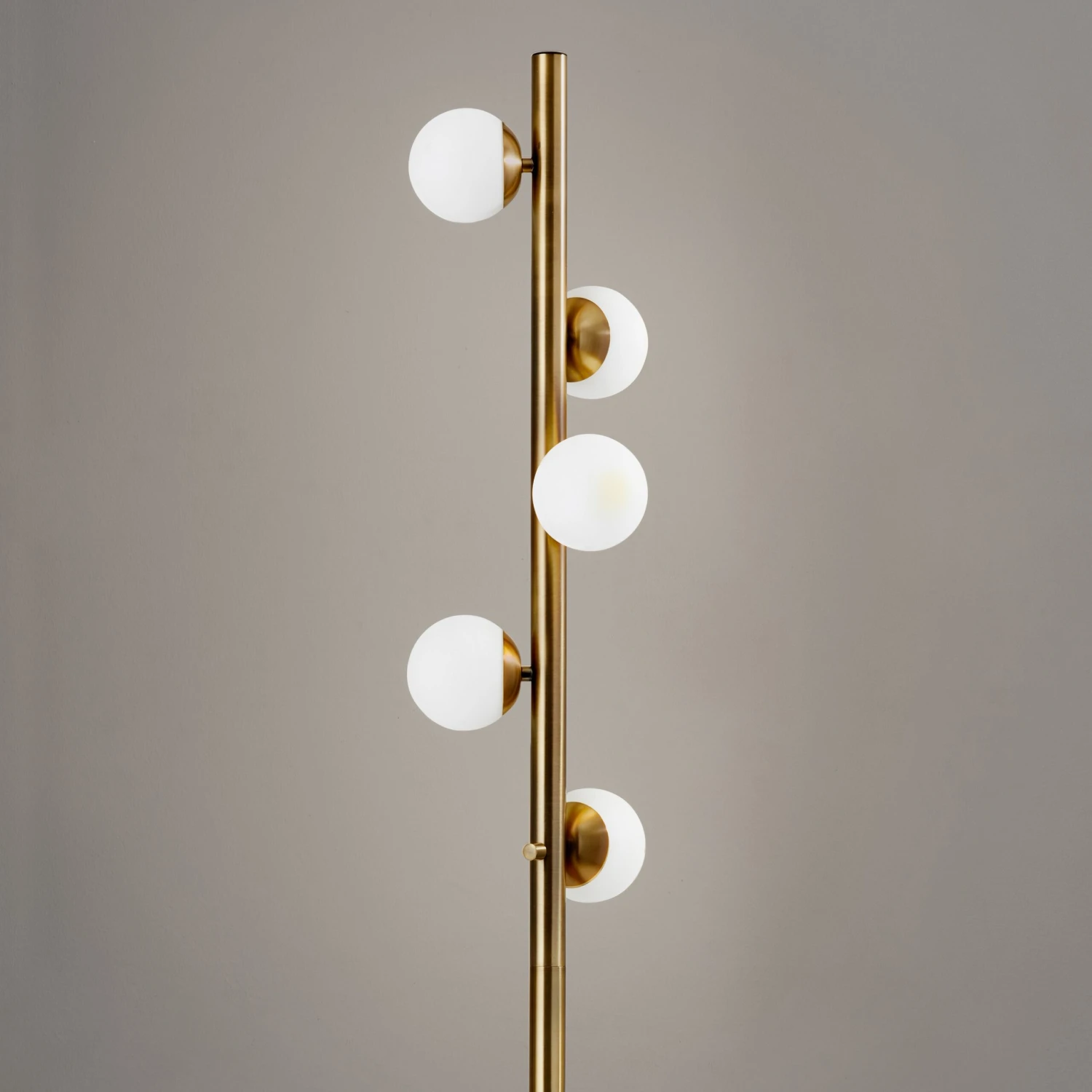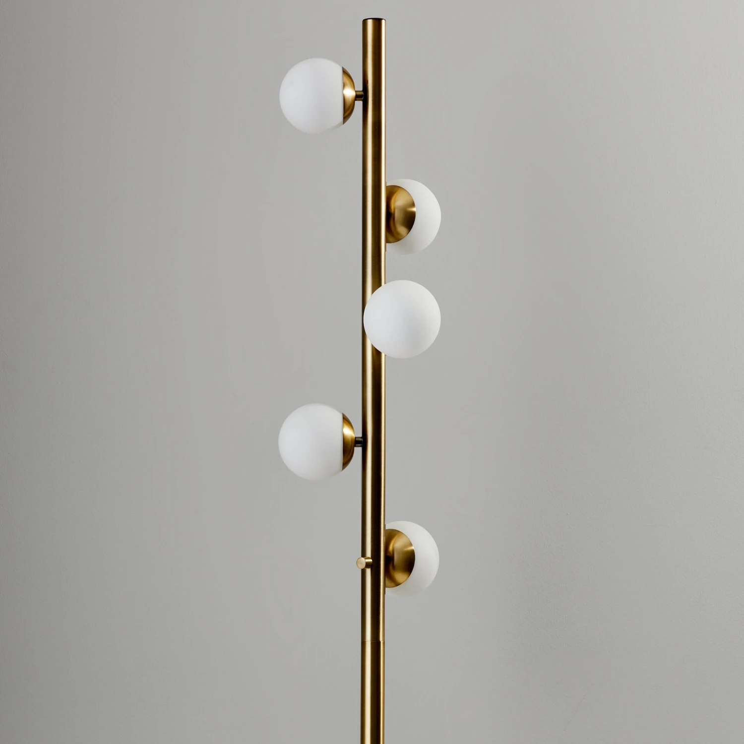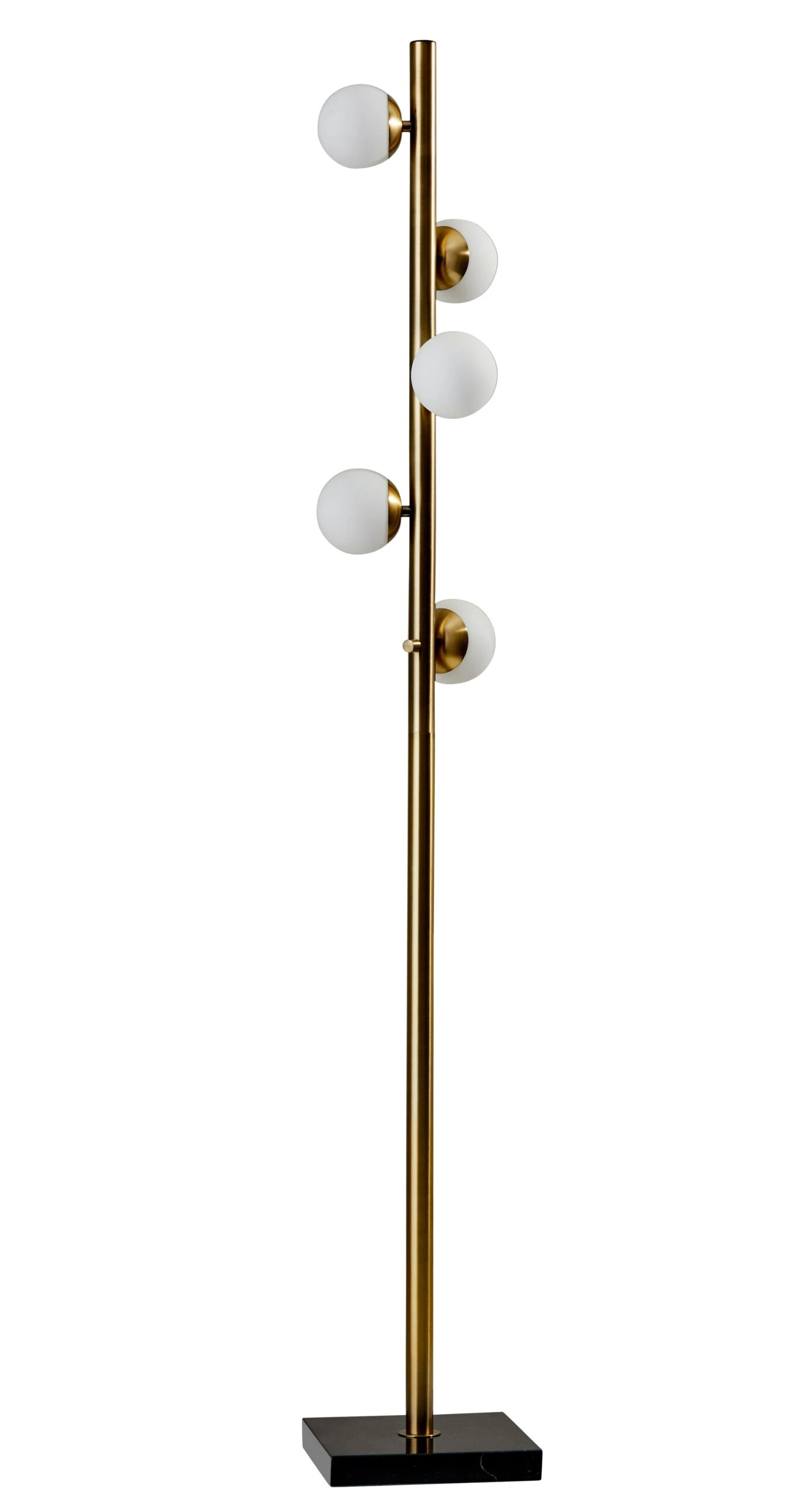 Supported by a black marble base, this floor lamp is designed with white glass globe shades that climb up its antiqued brass body. LED bulbs included.
