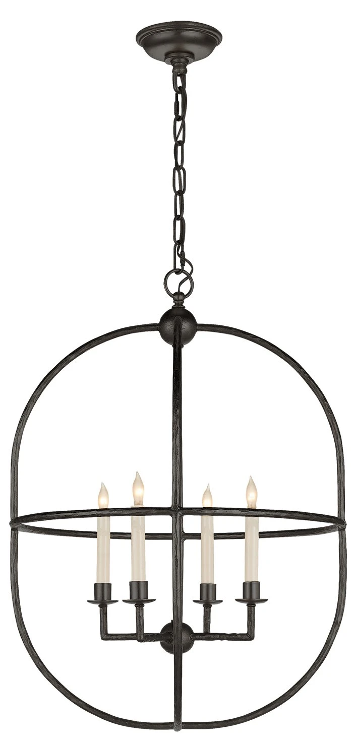 Slender rods of aged iron sweep around four candle-inspired lights in a stylized lantern shape, for a pendant that perfectly bridges traditional and contemporary aesthetics. Hardwired.