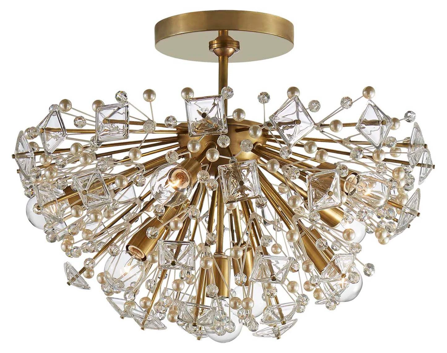Impactful, dramatic, and stunning from every angle, this showstopping fixture raises the bar on semi-flush mount designs with its bevy of brass spokes and faceted pieces of squared glass. Hardwired.