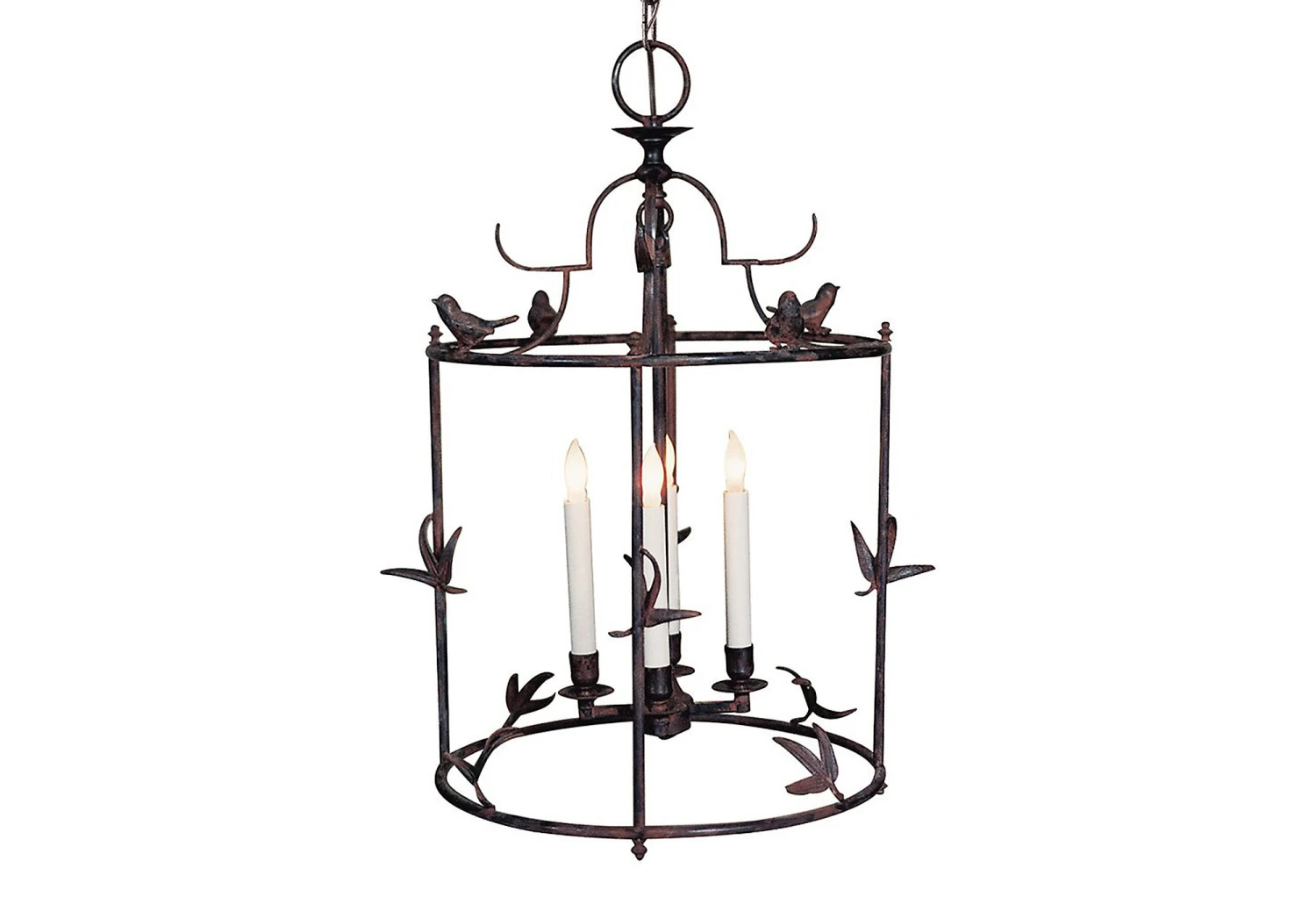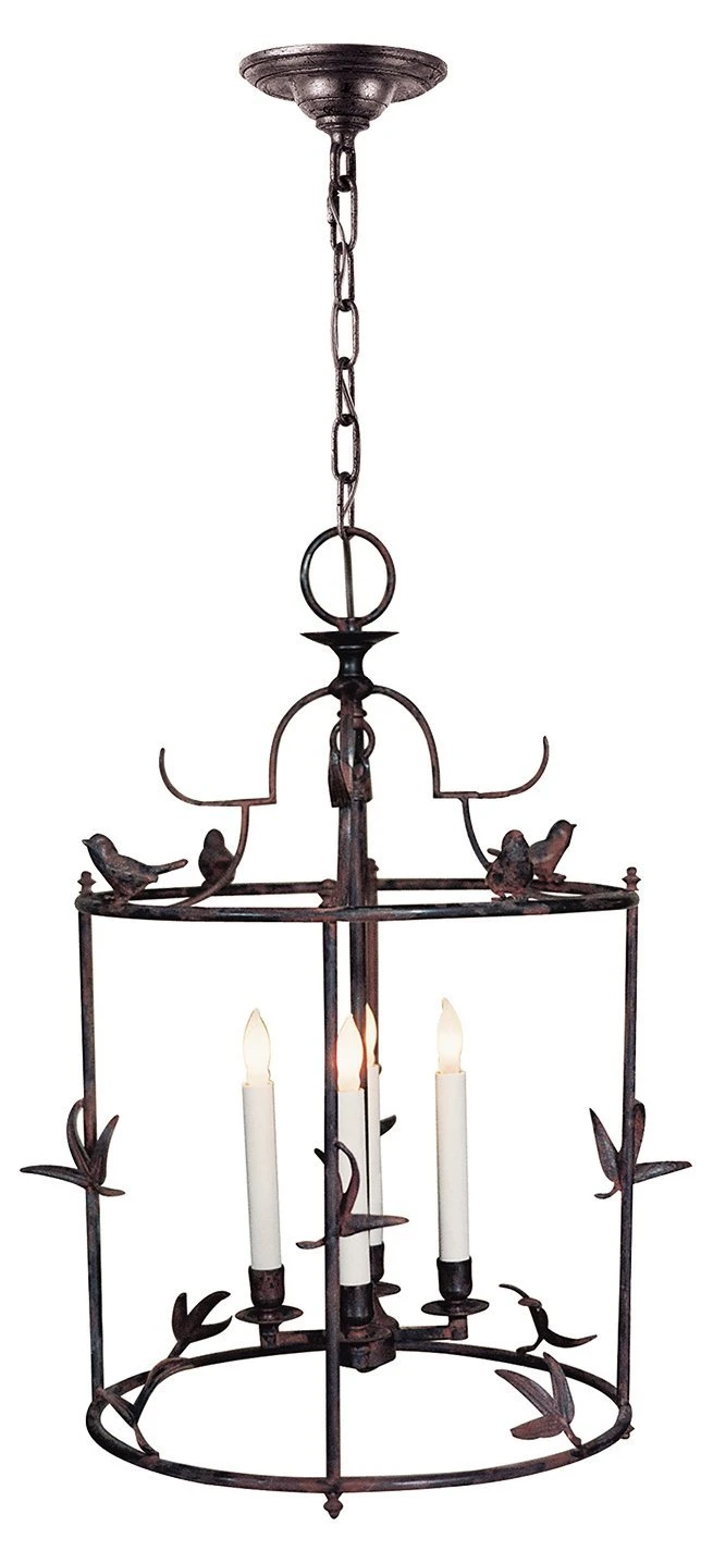 This hanging lantern is crafted of iron with an open caged structure that’s softened by leaf-and-bird embellishments. A deep rust finish completes the look. Hardwired.